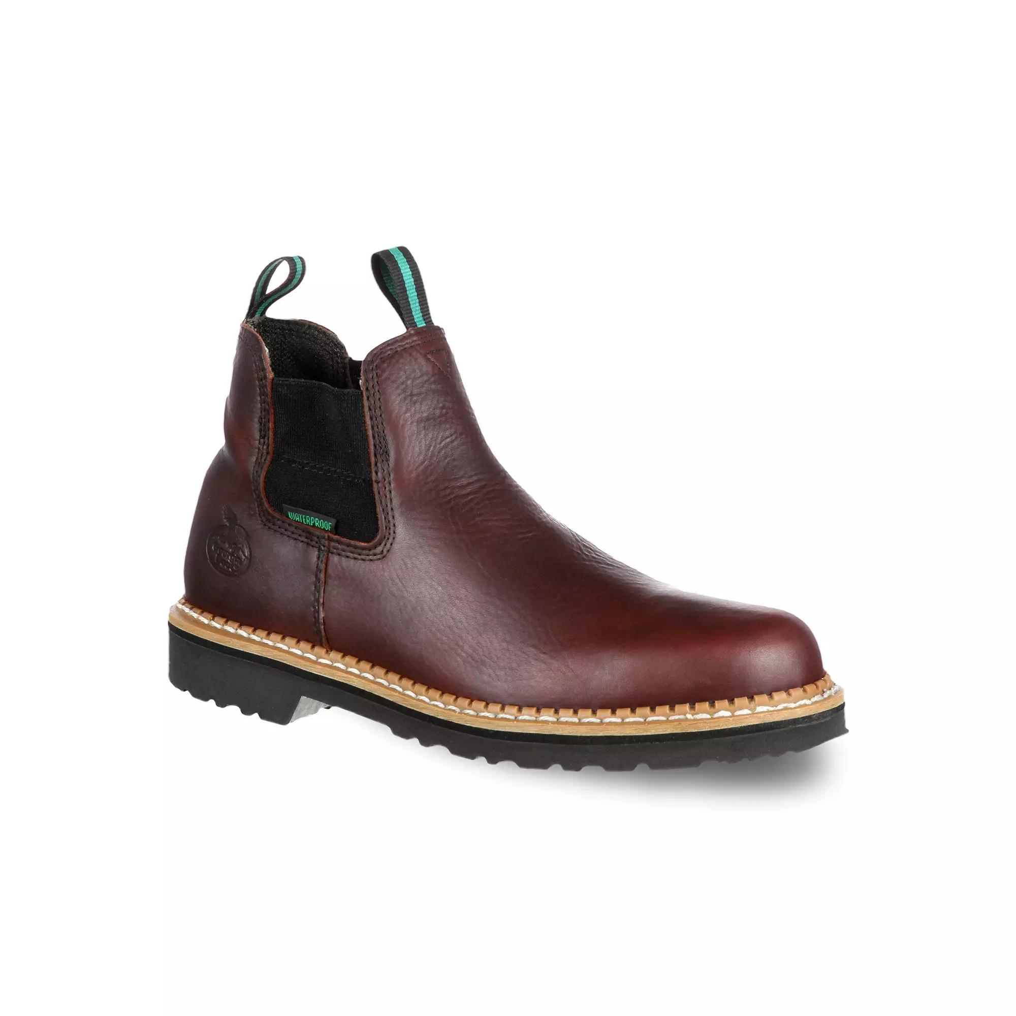 This Georgia Giant waterproof Romeo work boot doesn't just look good, it's well-constructed and comfortable. Made with the Georgia Waterproof system, these boots keep water out while letting air in. Your feet stay dry, guaranteed. The polyurethane "Georgia Giant" outsole resists oil, chemicals and slips. Goodyear welt construction added durability. Inside is steel shank, EVA midsole, removable cushion insole and high-performance lining, providing added comfort and stability. This boot is made of rich full-grain leather and the pull tabs and twin gores make these boots easy to get on.