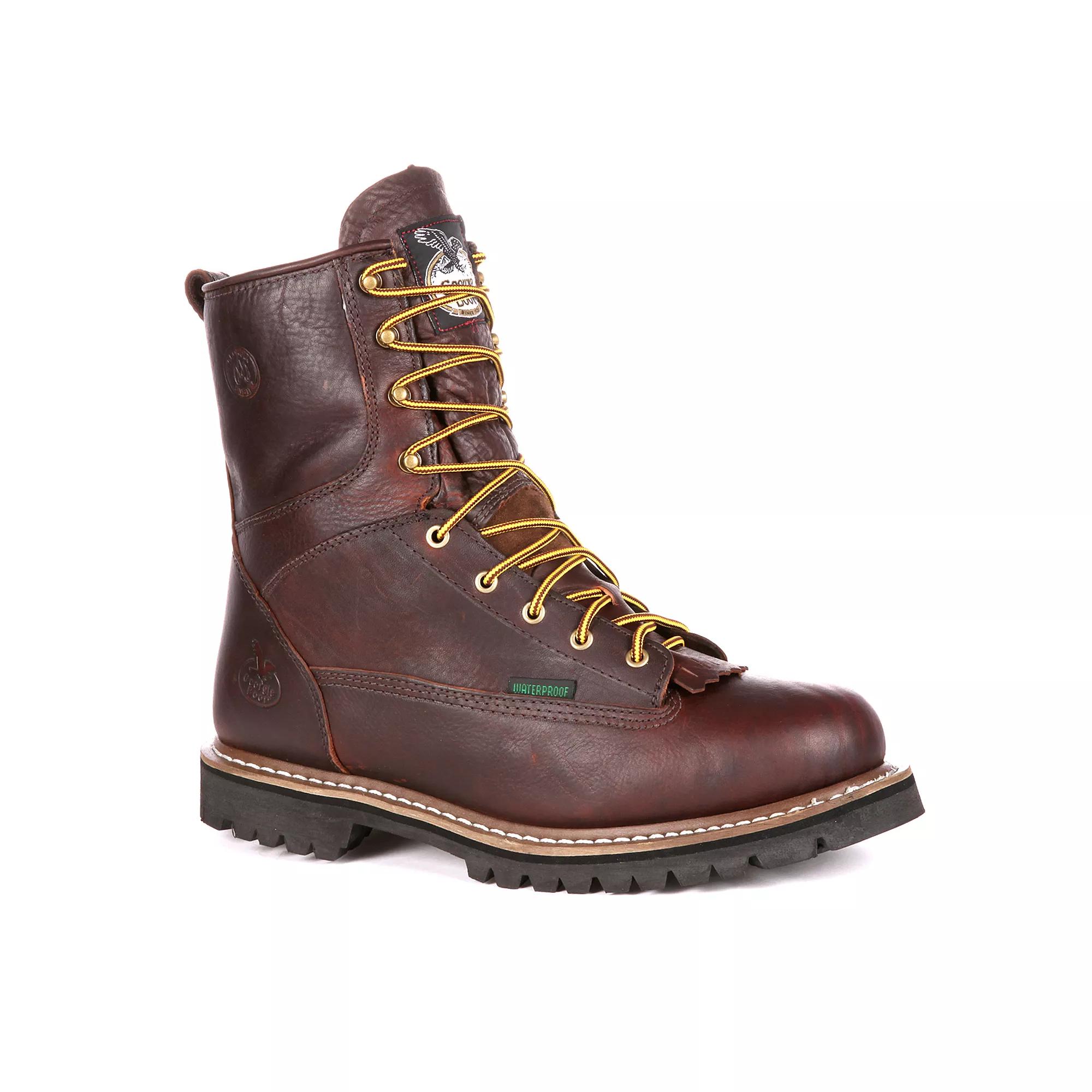 Your job is tough, and you need work boots that can keep up with you. These mens work boots from Georgia Boots are up to the task. Click this FOOTWEAR GUIDE to find the perfect fit and more!BOOT FEATURES Georgia Waterproof System allows air in and keeps water out. Rubber soles resist abrasion, oil, chemical and heat. Fully lined Covered cushion insoles for comfort Goodyear welt construction Brass hardware with solid stud hooks and eyelets BOOT CONSTRUCTION Leather upper Mesh lining EVA midsole Rubber outsole BOOT DETAILS Round toe Lace-up closure Padded footbed 1-in. heel 8-in. shaft 14-in. circumference Style no. G101 Size: Medium (9.5). Color: Brown. Gender: male. Age Group: adult.