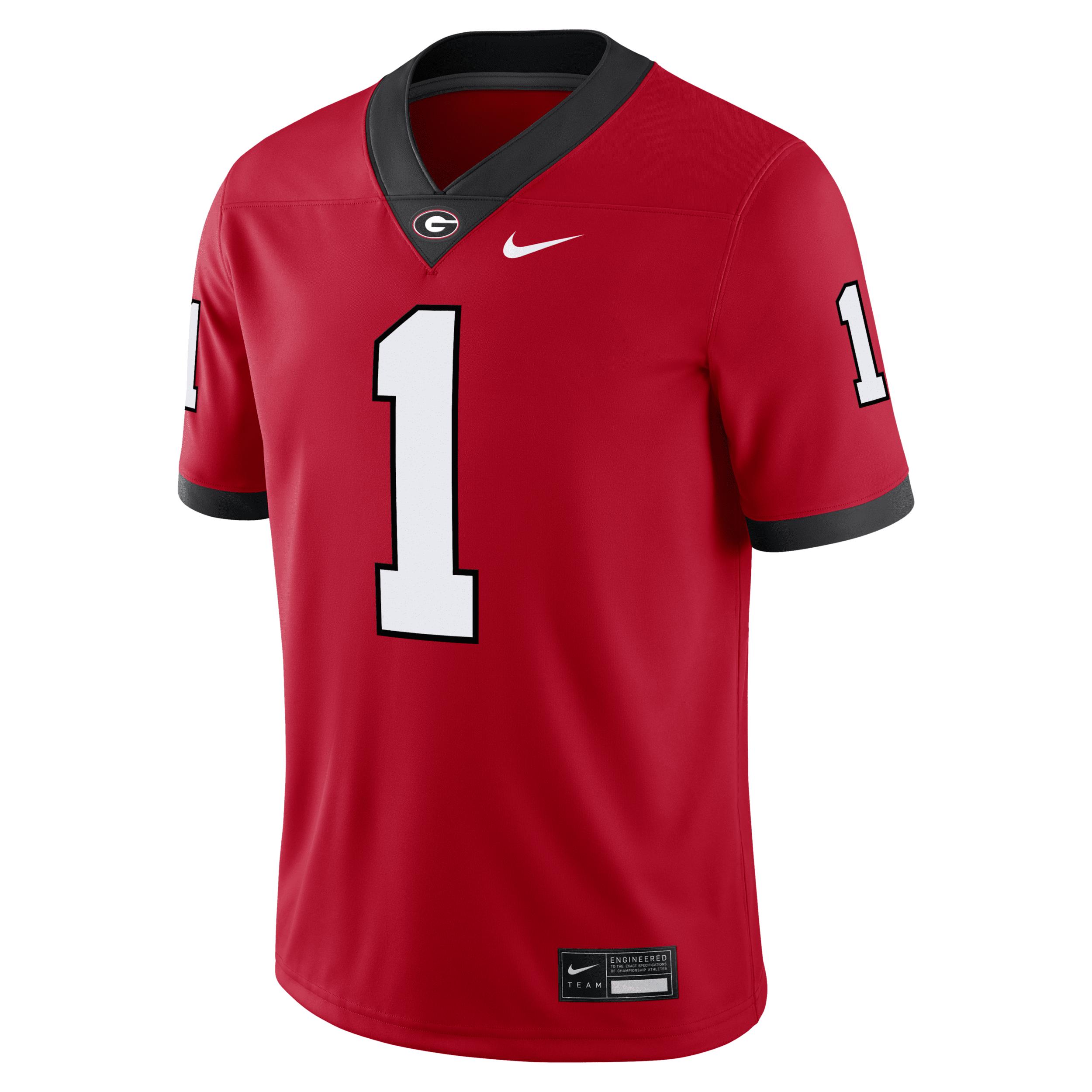 Inspired by the on-field uniforms of your favorite collegiate squad, this Georgia Bulldogs Jersey delivers an authentic touch with official team details. Sweat-wicking technology and lightweight fabric help provide consistent comfort on game day. Benefits:Nike Dri-FIT technology moves sweat away from your skin for quicker evaporation, helping you stay dry and comfortable. Double pique body fabric helps keep you cool and comfortable. Screen-printed name and number offer lightweight durability. Product Details:Standard fit for a relaxed, easy feel. Embroidered team logo at V-neck. Stitched-down twill woven jock tag. 100% recycled polyester. Machine wash. Imported. Style: CLEVGRJNC2FGEO; Color: University Red; Size: L; Gender: Male; Age Group: Adult | Georgia Bulldogs Men's Nike Dri-FIT College Game Jersey in Red, Size: Large | CLEVGRJNC2FGEO-GEO