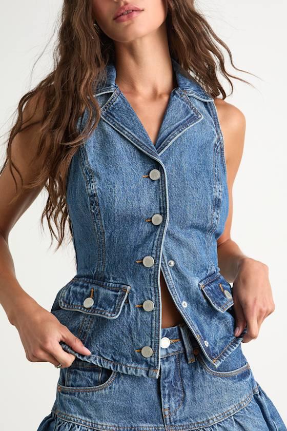 A too-cute twist on a classic look, this elevated denim vest top by Blank NYC was designed to be a crowd-pleaser and compliment-receiver. The sleeveless silhouette features a collared neckline, princess-seam detailing, and a front button placket framed by buttoning flap pockets. A peplum-style hem finishes the look in the flirtiest way. Pair with the matching skirt for a complete look!