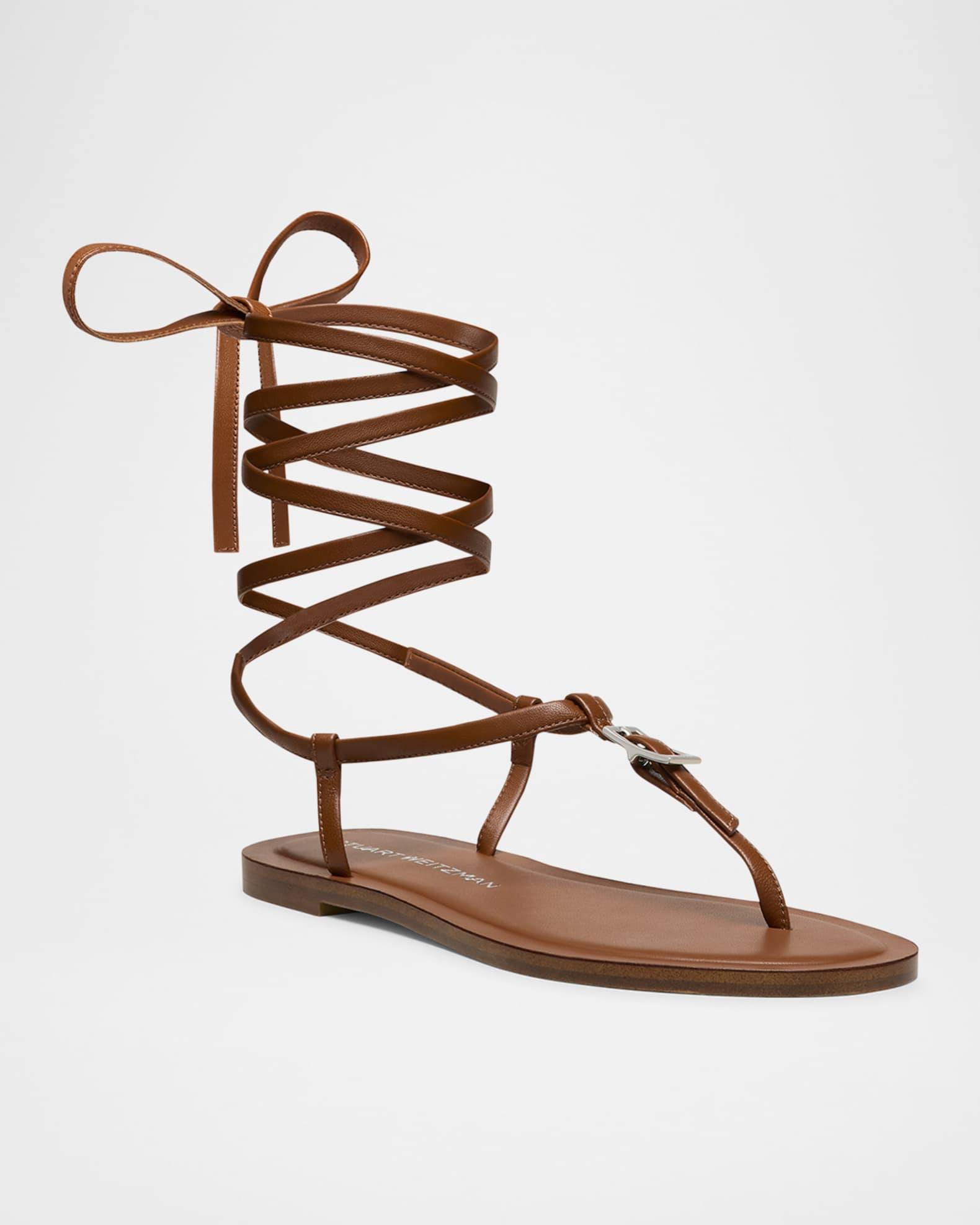 Stuart Weitzman "Georgie" leather summer sandals 0.17 in / 5 mm flat heel Buckle thong strap Wraparound ankle ties Leather outsole Lining: Leather Professional cleaning recommended, hand wash, spot clean Made in Spain Shipping Direct from Vendor, usually ships within 15 business days.