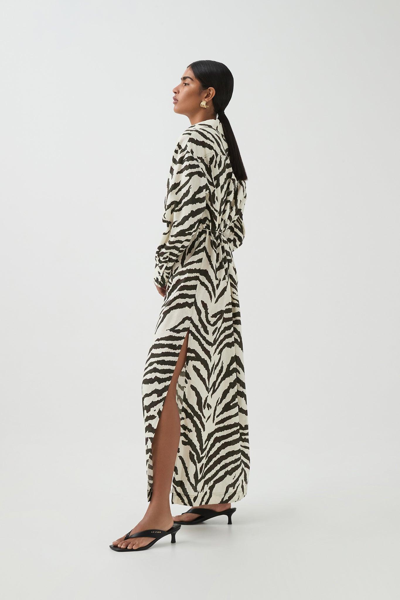 PRODUCT DETAILS Aje Studio Maxi shirt dress Relaxed, boxy fit Shirt collar Front placket with pearl bead buttons Logo patch at back Side seam splits 55% Linen 4...
