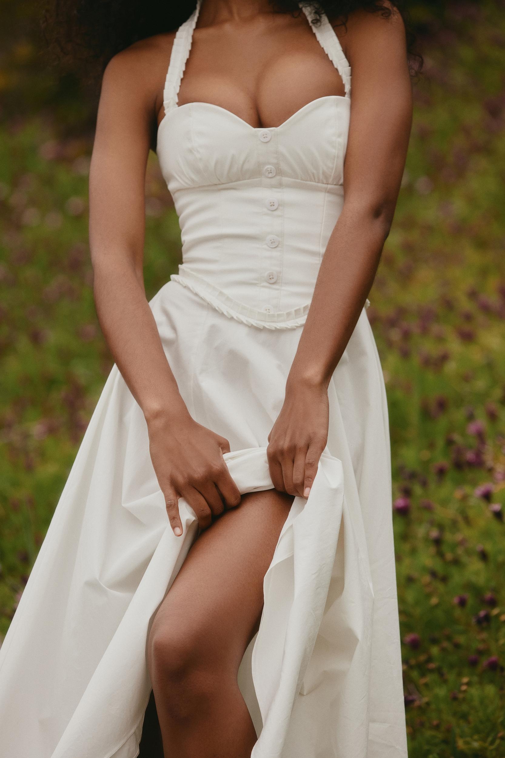 Let 'Georgie' charm you with a beautiful sweetheart neckline and delicate floaty skirt – it's the ultimate combination for feeling your best in the sunshine. It's cut from white stretch cotton and shaped to a gentle midi silhouette with halter straps that secure at the back of the neck. The bust is cupped giving it a classic vintage feel with buttons down the front adding to the vibe, while the zip at the back brings an ease to the fit.