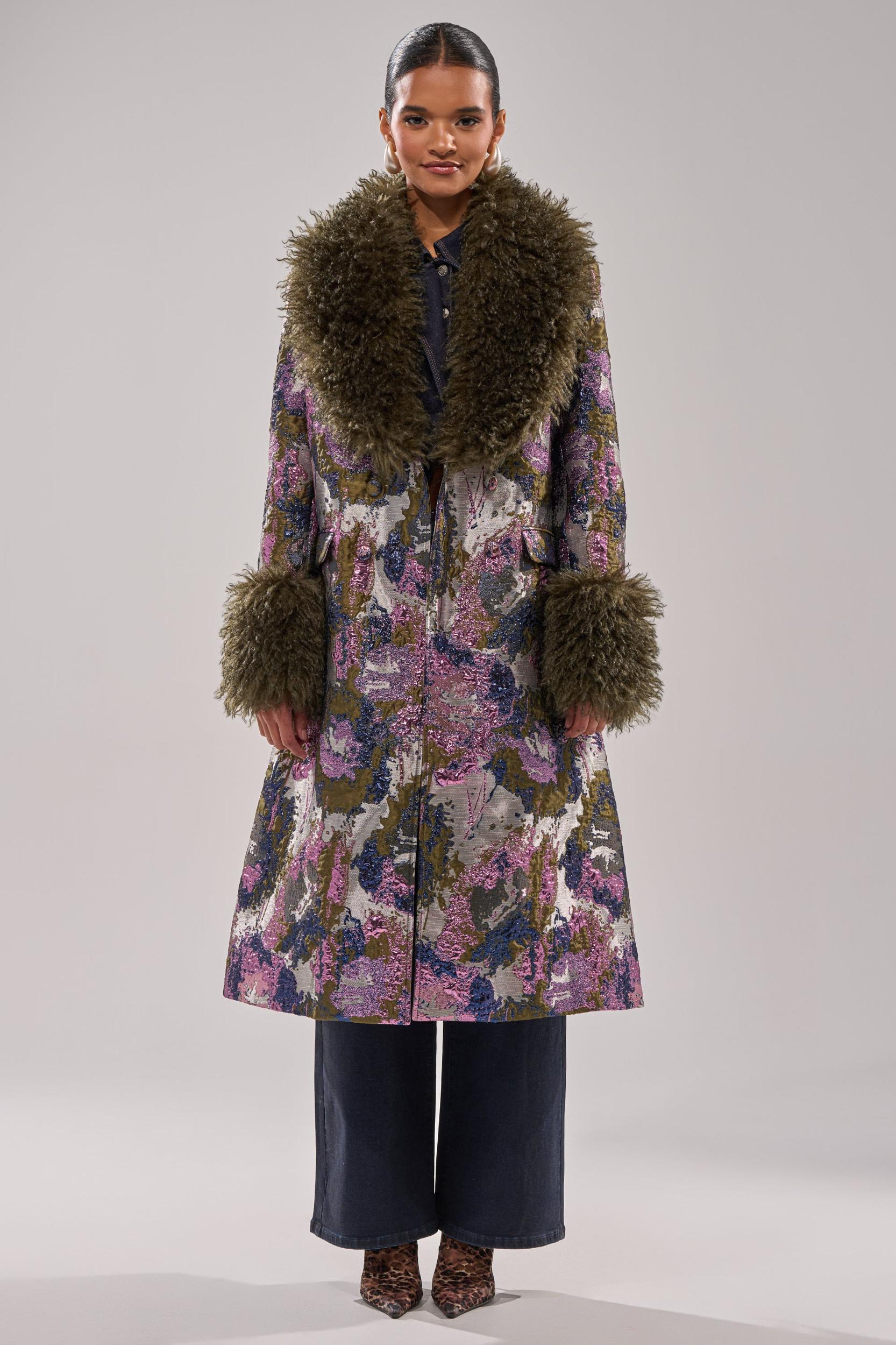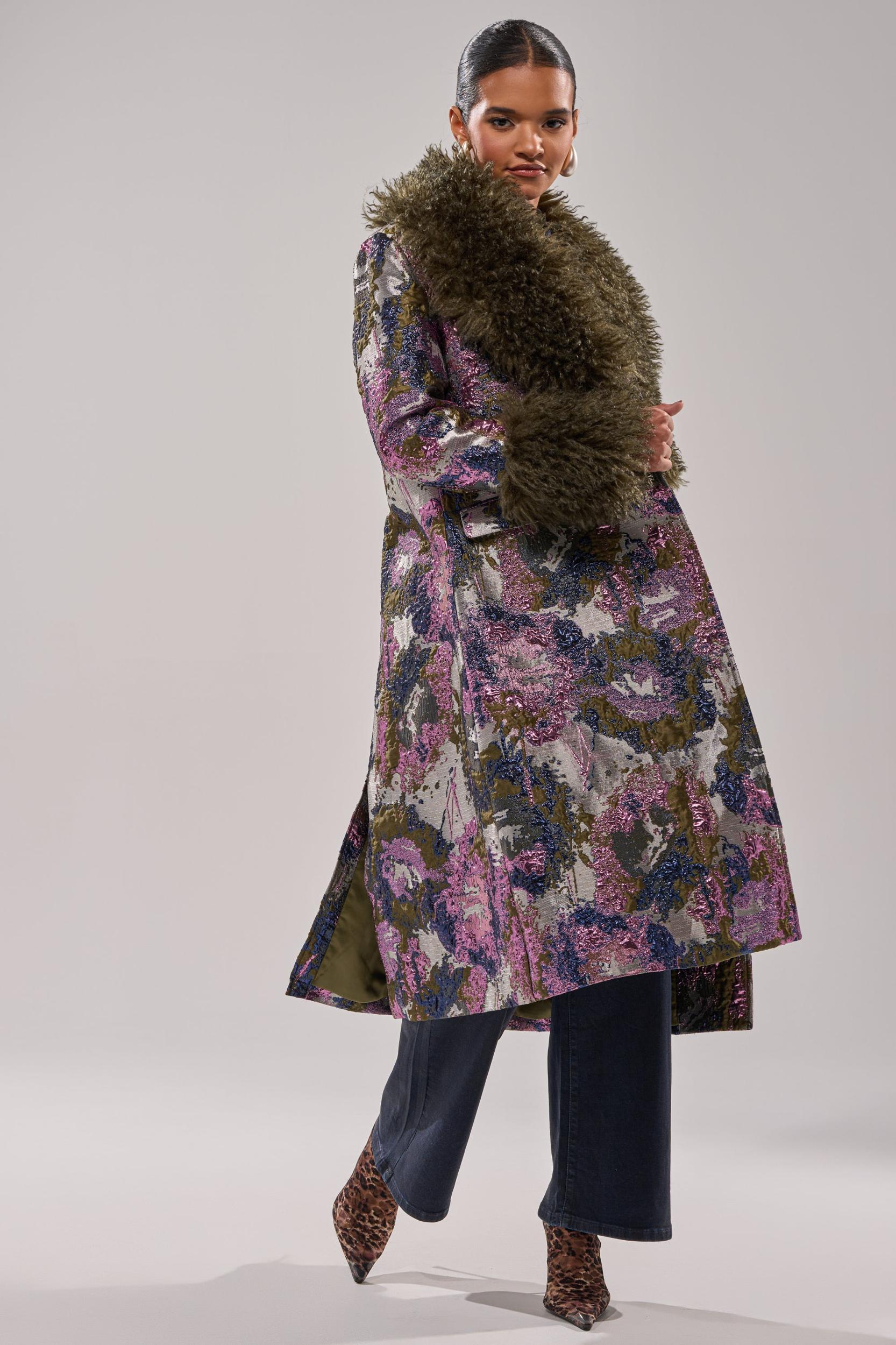 Brocade & bougie in The AKIRA Label Georgina Brocade Trench. This lustrous style is crafted from a multi-color, metallic brocade fabric and boasts a notch lapel collar, long sleeves, removable plush faux fur trim on the neckline and sleeve cuffs, waist flap pockets, a back vent slit, button front closures, and a sleek inner lining. Complete with a cinched, longline silhouette. Throw over your favorite sweater for an elevated winter ensemble. - Shell: 100% Polyester, Lining: 95% Polyester 5% Spandex- No Stretch- Imported (all measurements approximate from size small)- 46” Shoulder to Hem- 17” Shoulder to Shoulder- 25” Sleeves- Model is 5’9” and is wearing size smallProduct ID: 1066276