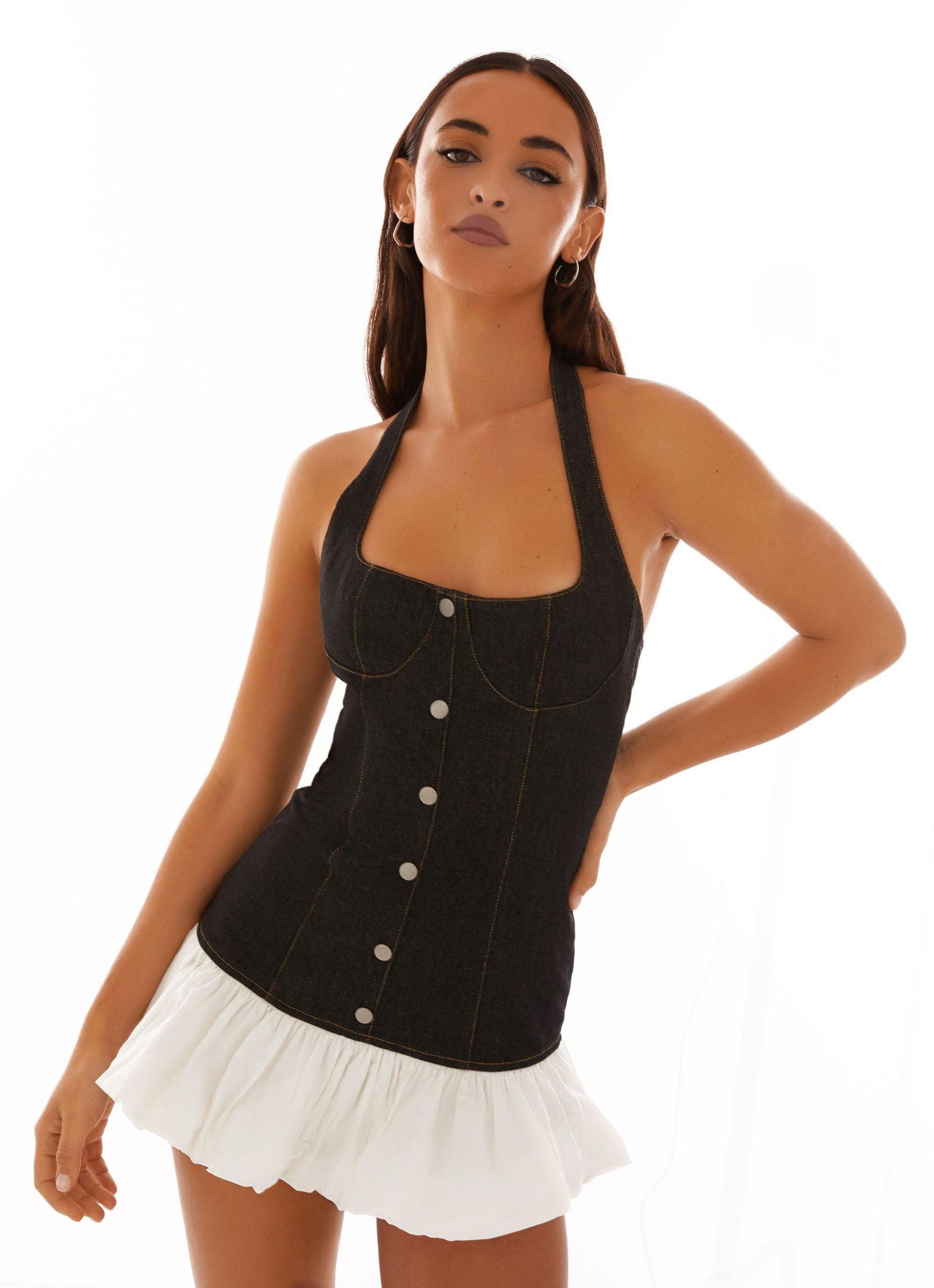 Peppermayo Exclusive The Georgina Denim Mini Dress features a square neckline and a buffed hem for a sleek, modern finish. The back bodice is designed with elastic for a comfortable and flattering fit. This dress combines classic denim with a stylish, contemporary silhouette. - Mini length- Square neckline- Halter neck- Bustier detailings- Front metal buttons- Puffed hem- Elasticated hem- Back bodice elastic- 100% cotton Size AU 8 / US 4 garment measurements: Bust: 78 cm / 30.7 in.Waist: 66 cm / 26 in.Hip: 88 cm / 34.6 in. Roberta is 177cm and wearing a size AU 6 / and US 2