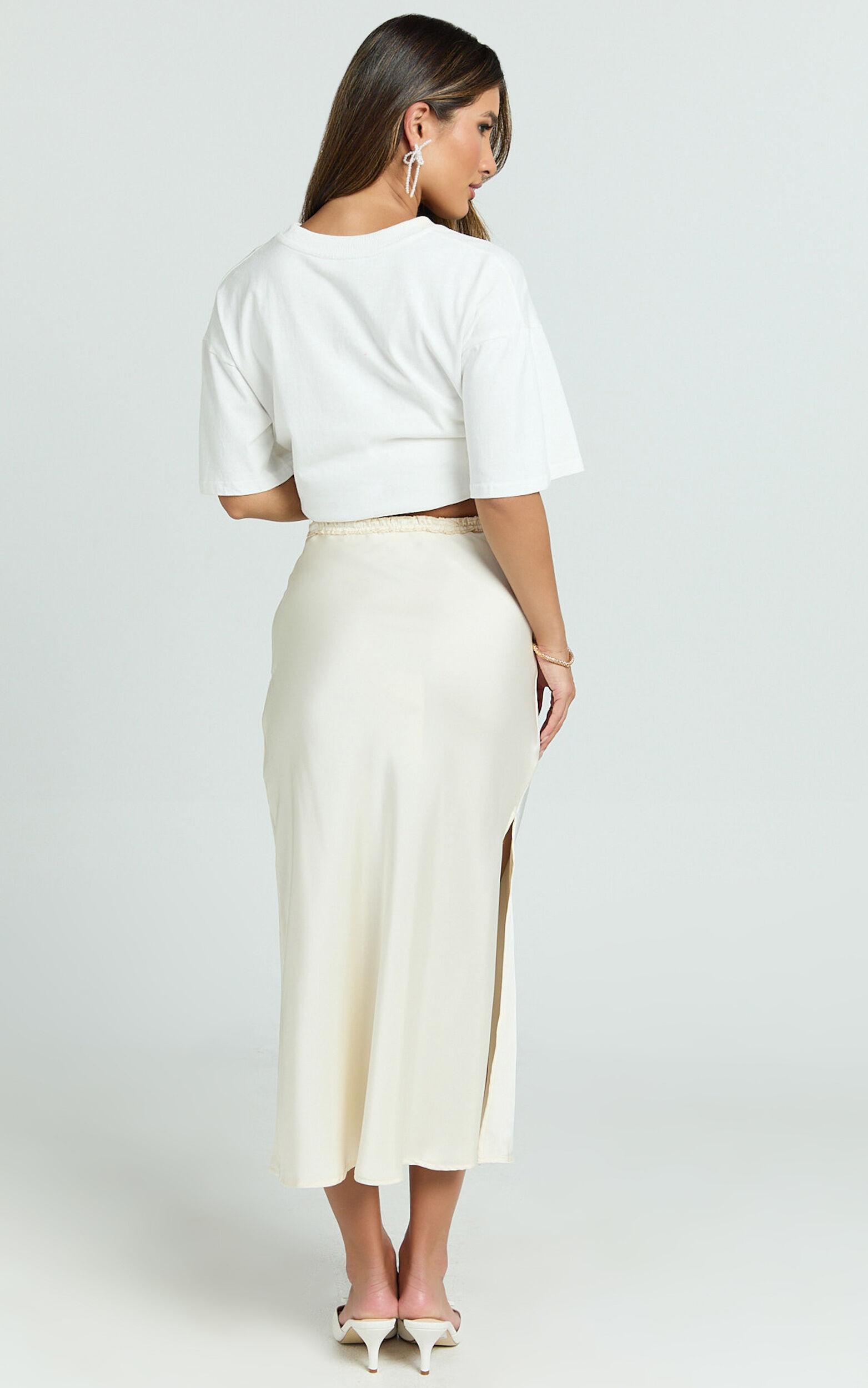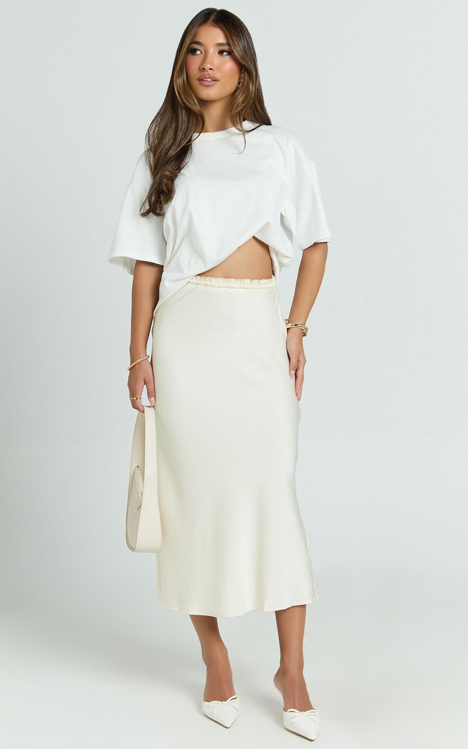 Transform your look with the Georgine Midi Skirt, a must-have piece that effortlessly takes you from day to night with a playful and flirty twist. This mid-waist slip skirt, crafted in a luxurious cream satin, is an instant wardrobe classic for the trend-setting Gen Z and Millennials.Product Details:Slip SkirtSatin FabricCasual, Party DayMidi LengthMid WaistPolyester MaterialSize and FitStudio model is wearing size XS / 6 AU / 2 US / 6 UK / 34 EUStudio model's height is 168cm / 5'6''Material and Care95% Polyester, 5% SpandexLow / No stretch