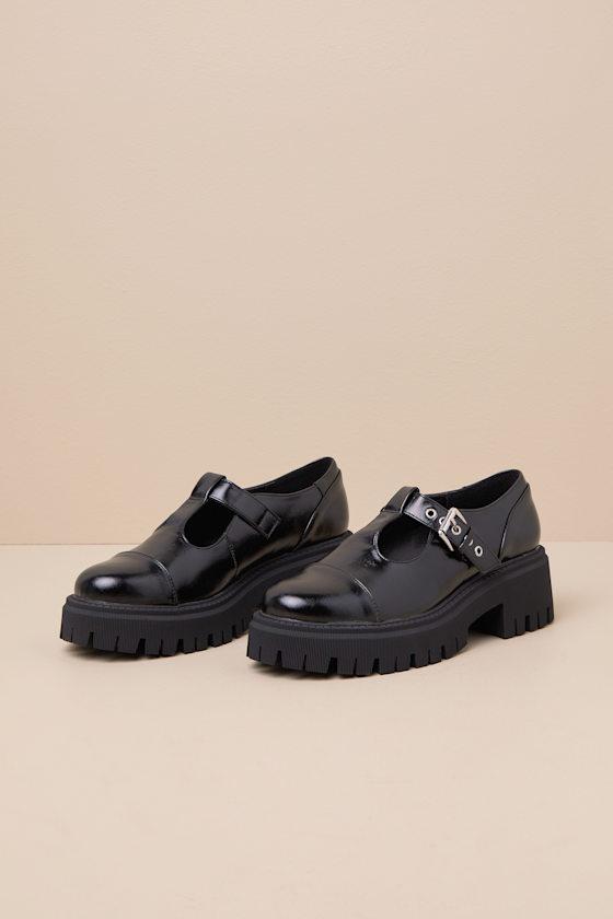 Add some '90s-inspired flair to your 'fit with the DV by Dolce Vita Georgio Black Lug Sole T-Strap Loafers! Sleek faux leather creates a classic capped round toe, a loafer silhouette, and an adjustable T-strap with industrial-inspired silver grommets. 1.5" lug sole toe platform provides a bit of lift for an edgy finish!