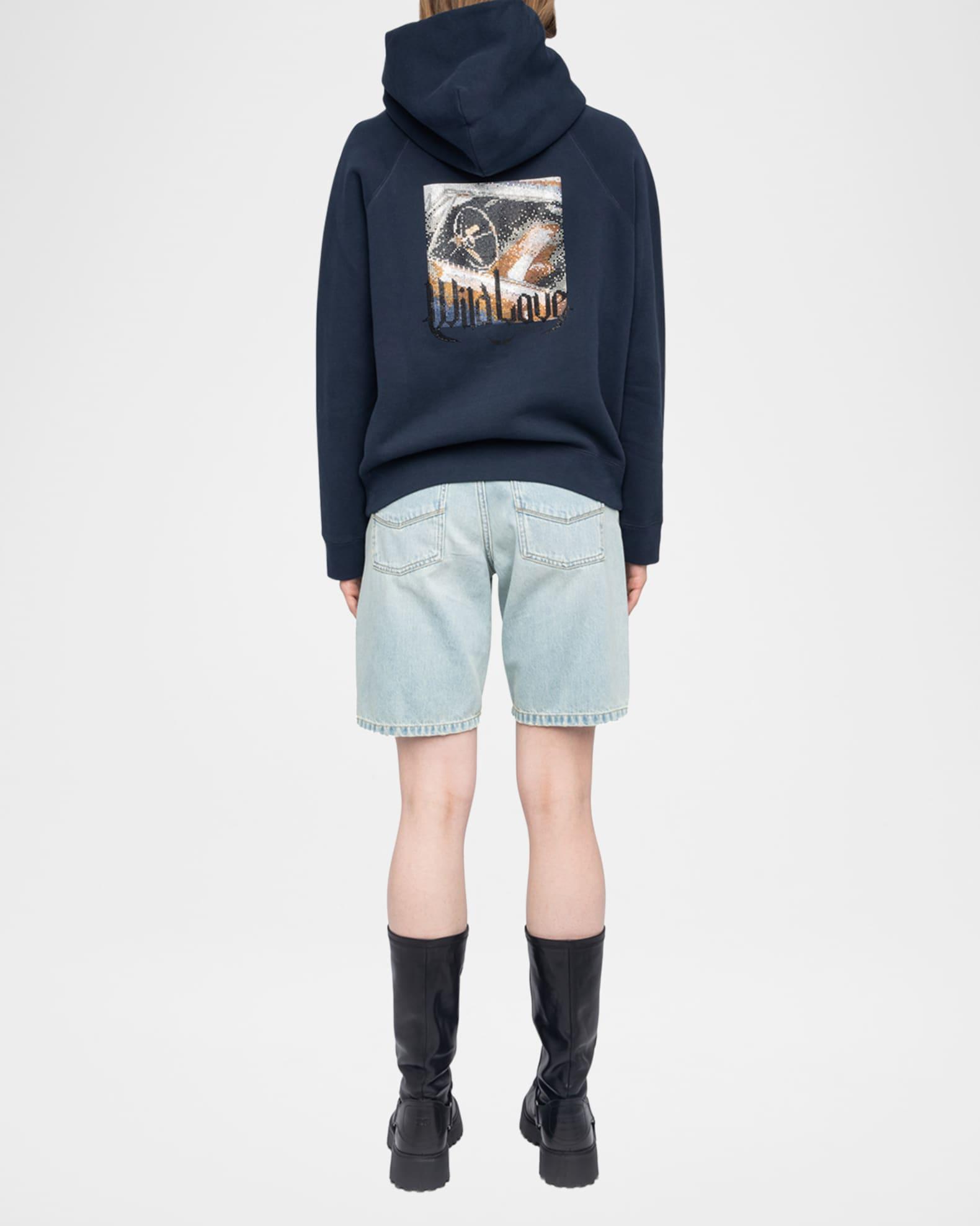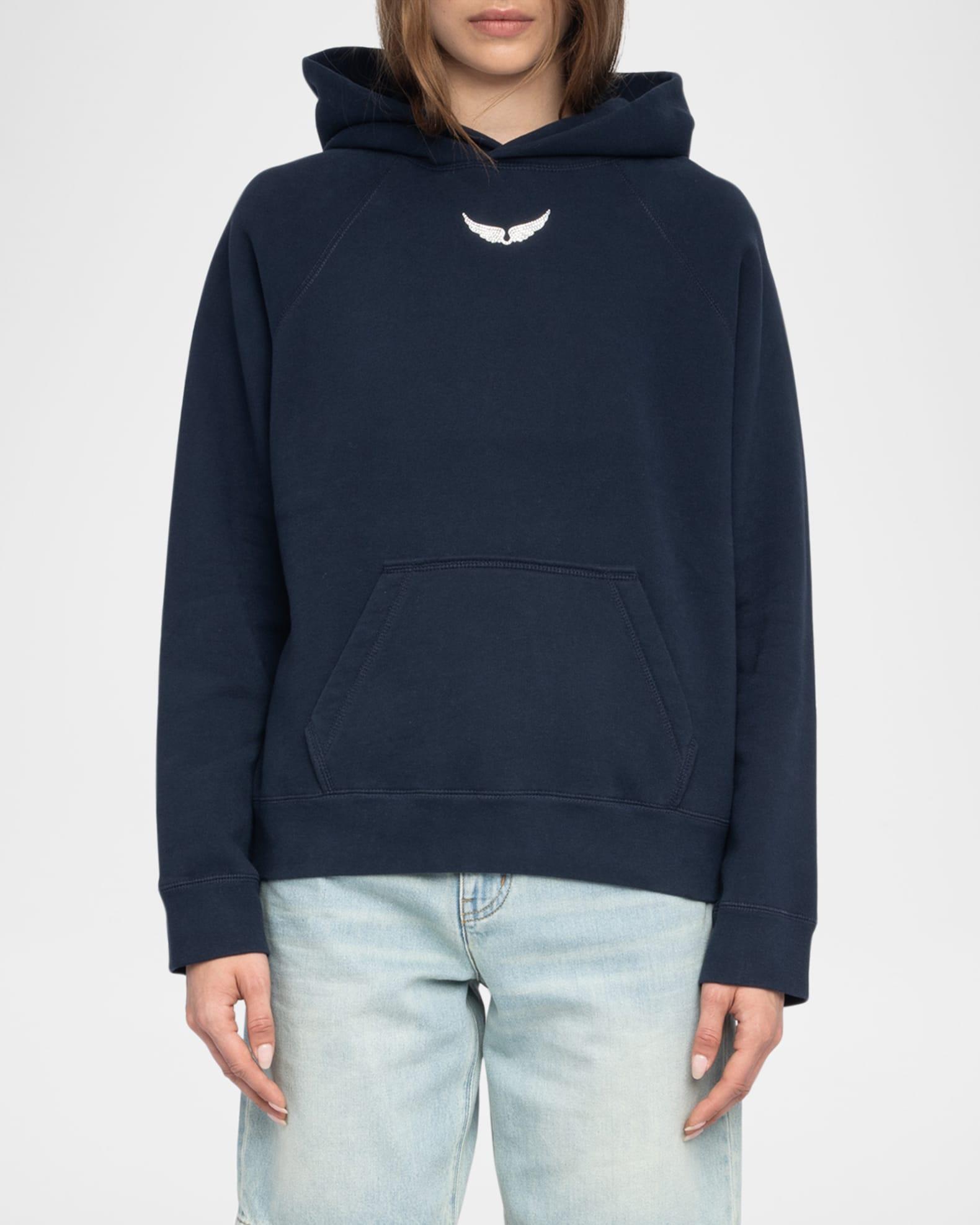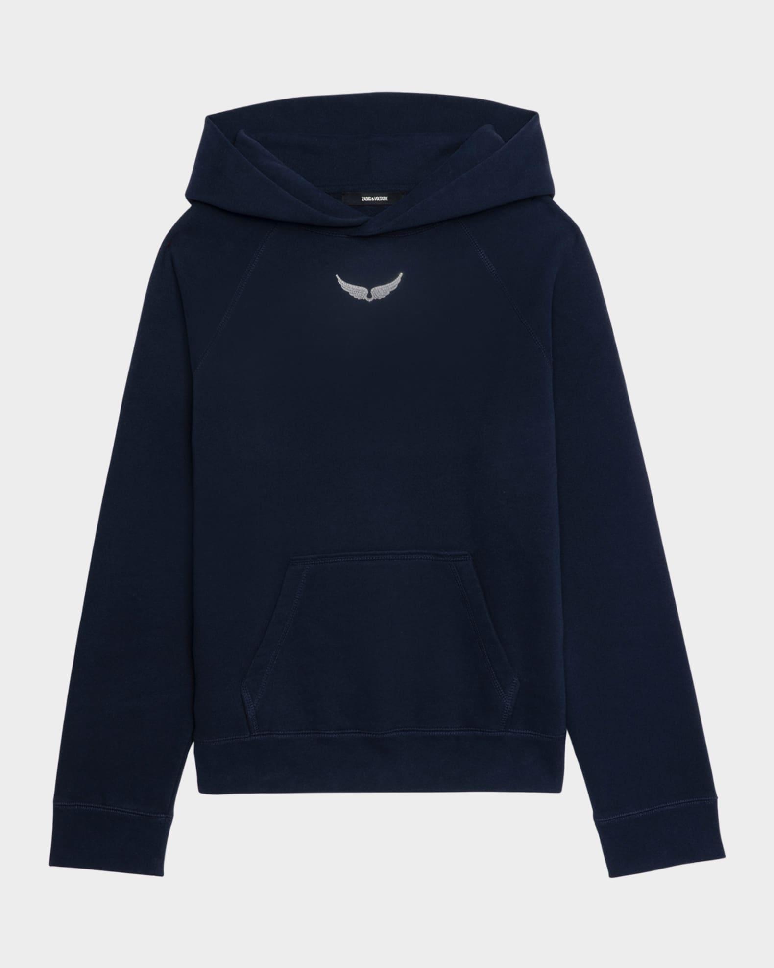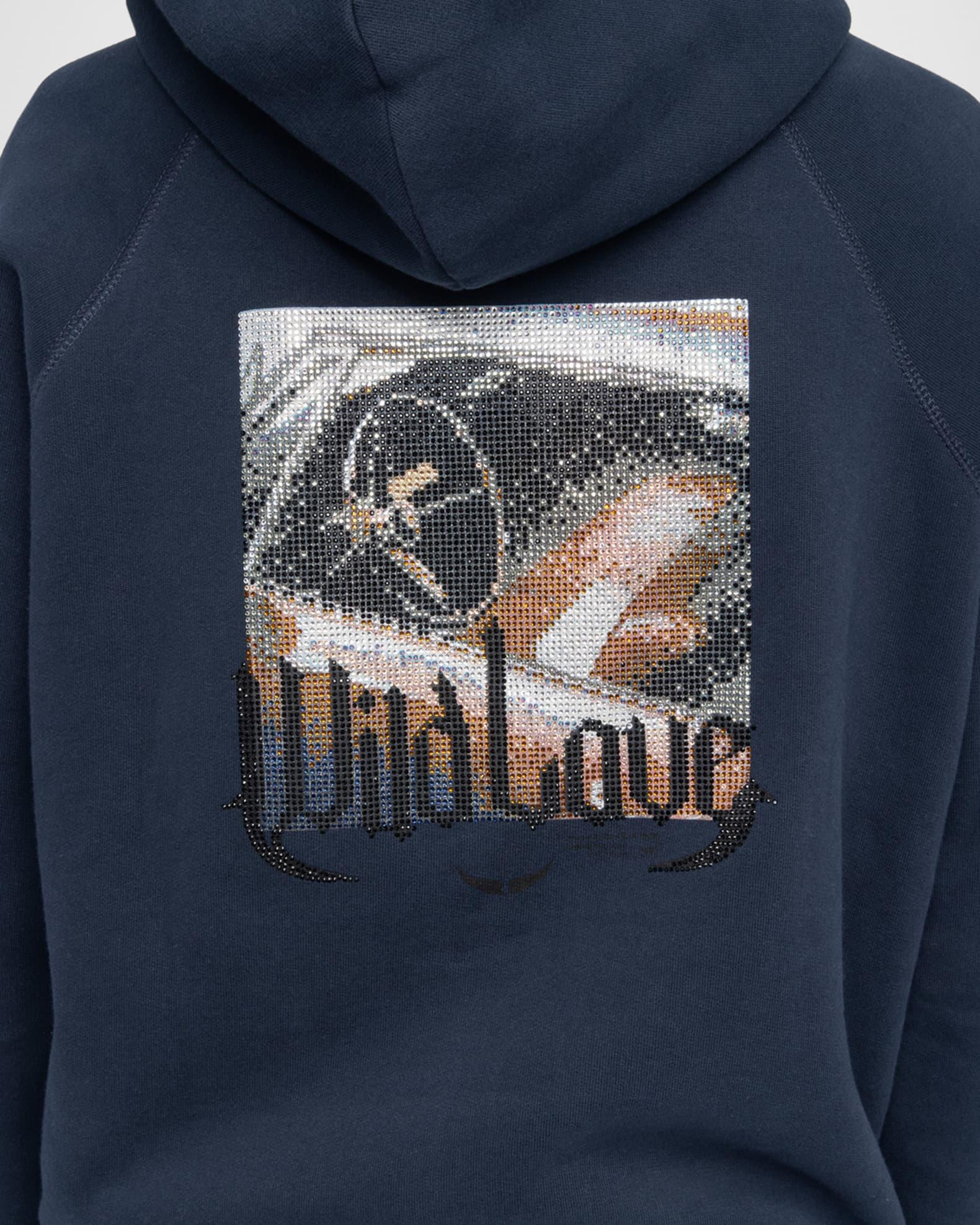 Zadig & Voltaire "Georgy" sweatshirt with rhinestone-embellished back photoprint Hooded neckline Diamante ZV wings at chest Long raglan sleeves; banded cuffs Kangaroo pouch pocket Relaxed fit Hip length Pullover style Cotton/polyester Machine wash cold, line dry Made in Portugal
