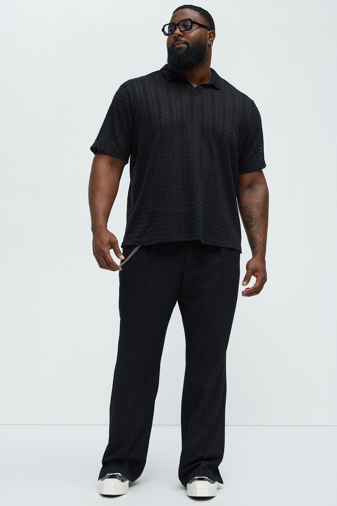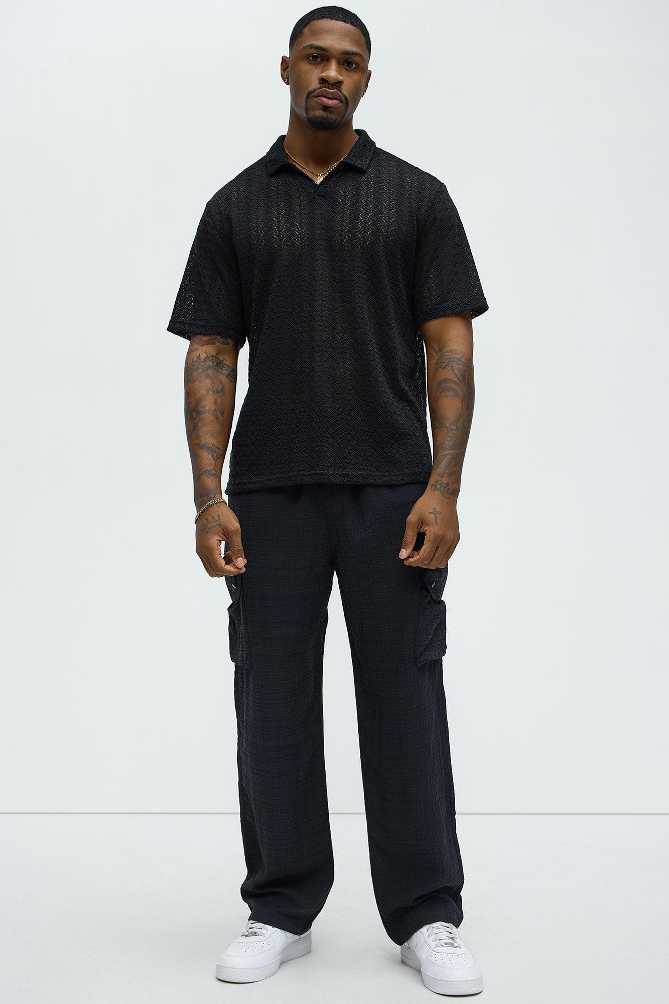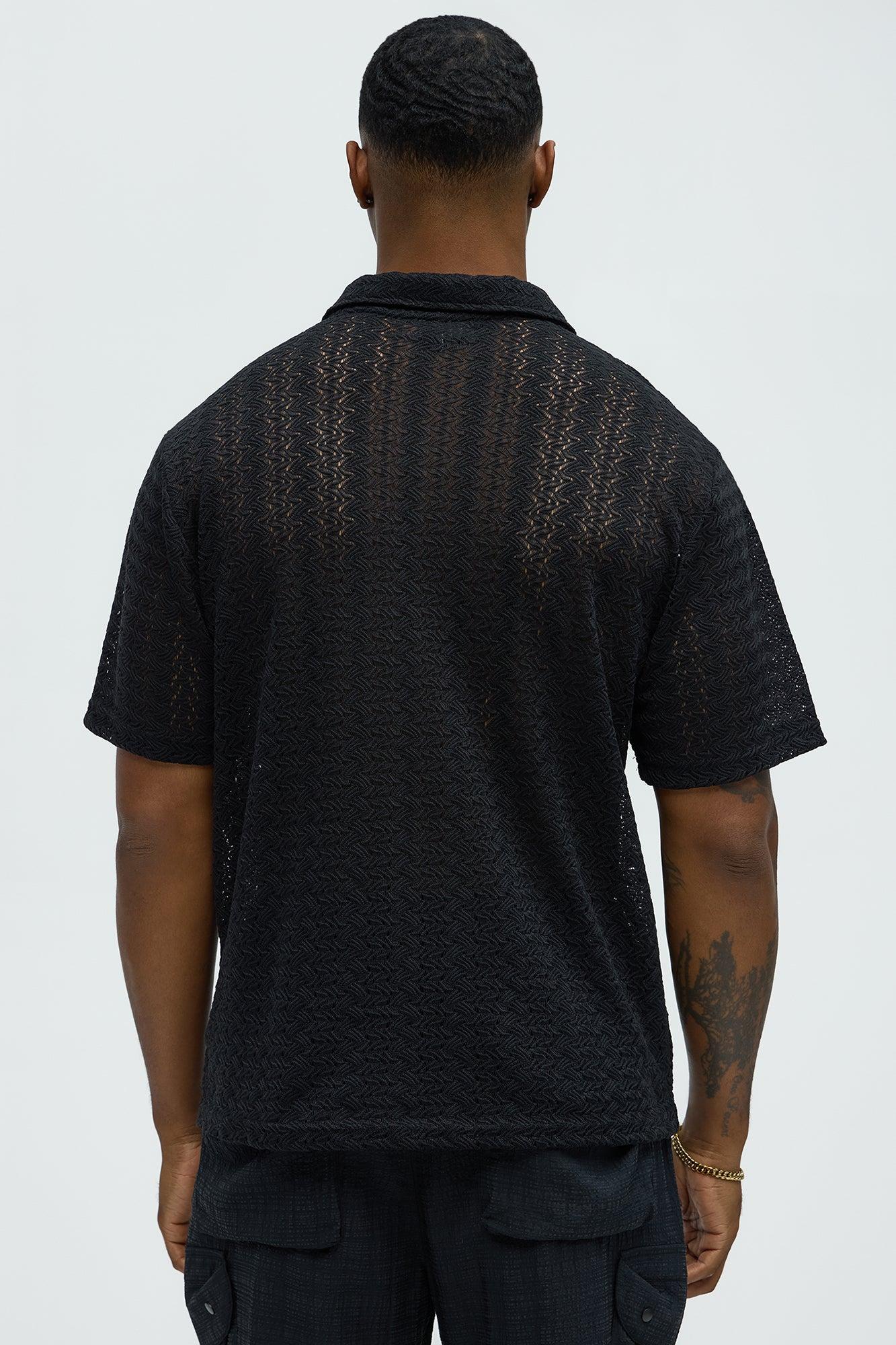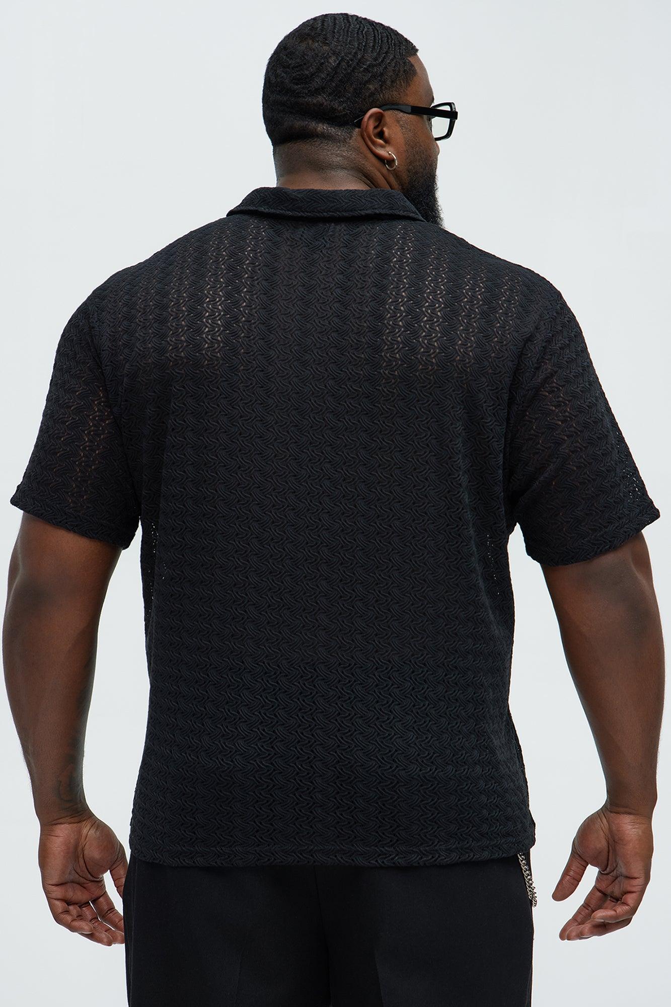 Available In Black. Johnny Collar Textured Crochet Short Sleeves 98% Polyester, 2% Spandex Disclaimer: This garment has been made with delicate materials and may snag or pull if jewelry or watches are worn. Do not wash with items that may cause snagging such as zippers or hooks. This garment is unique and must be handled with care. Imported California Proposition 65 WARNING: Cancer and Reproductive Harm - www.P65Warnings.ca.gov.
