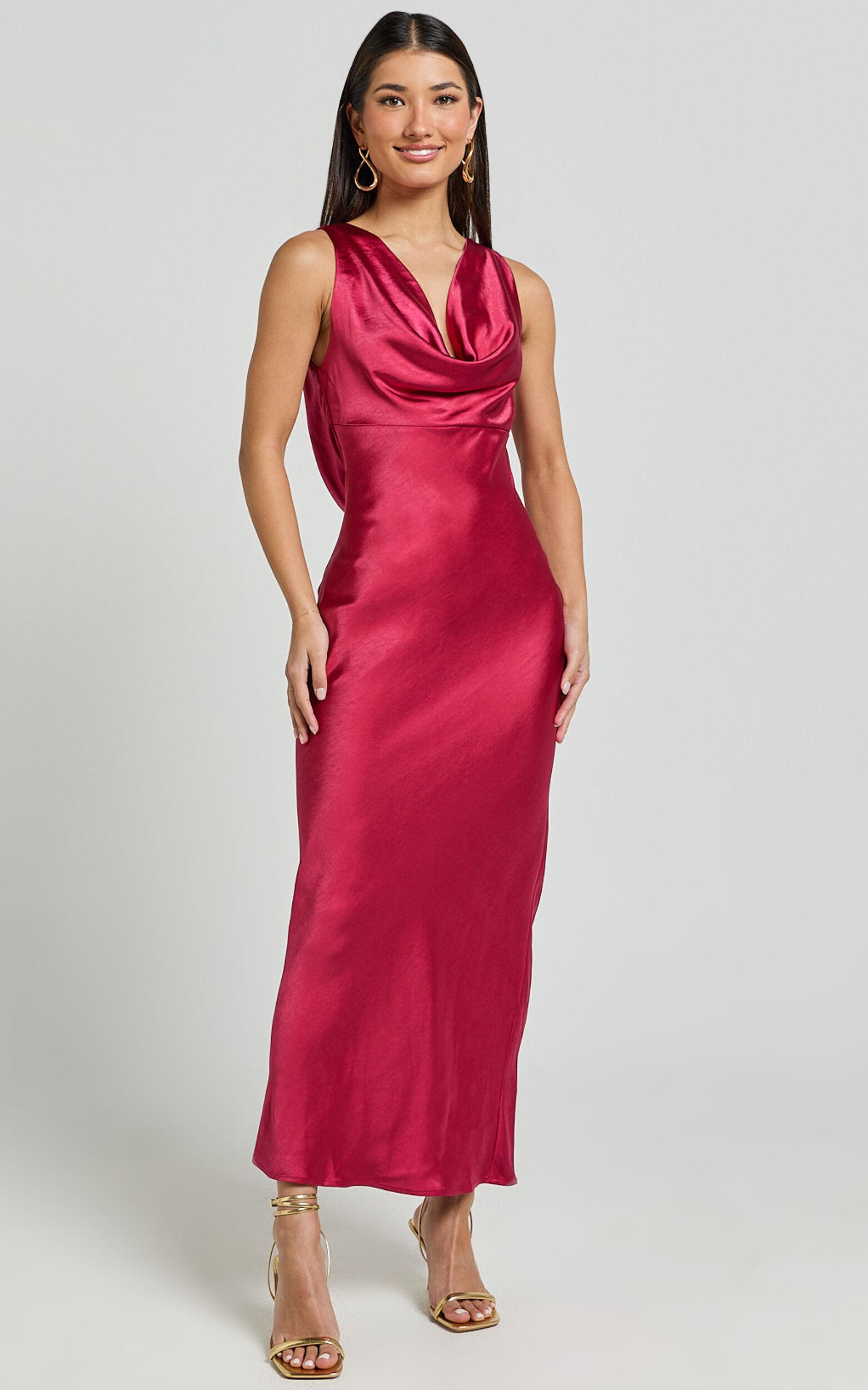 Elevate your style with our enchanting Geri Midi Dress! This alluring cowl neck, low back satin dress in a rich berry hue is your new go-to for turning heads and sparking conversations. Perfect for that upcoming special party night, this slip dress embodies everything you adore - sophistication with a flirty twist.Product Details:Inner LiningPull on styleSlip DressSatin FabricBackless NecklineParty Night WearMidi LengthSleevelessPolyester MaterialSize and FitSize S / 8 length: 136cm / 53.54inMaterial and Care100% PolyesterNo Stretch