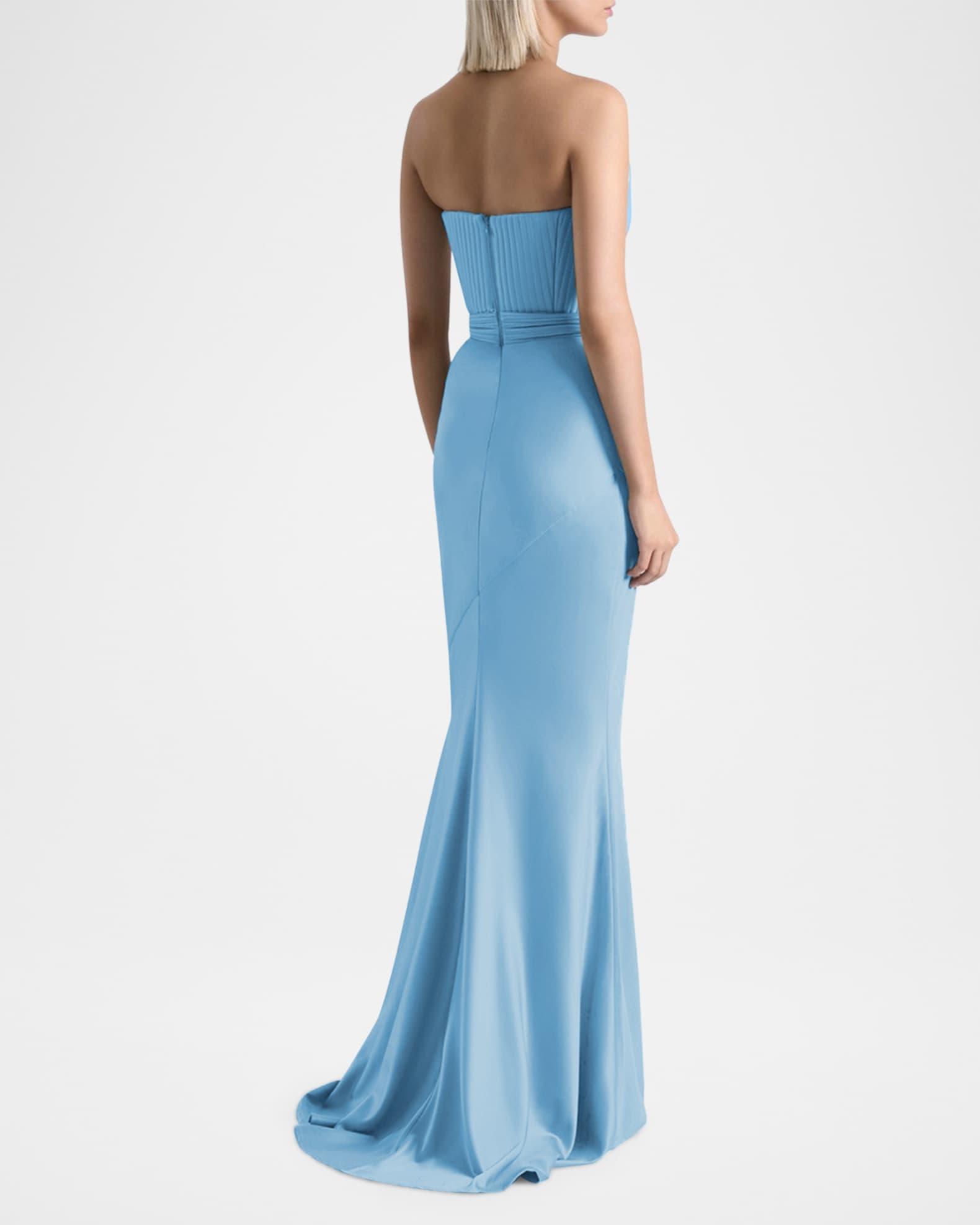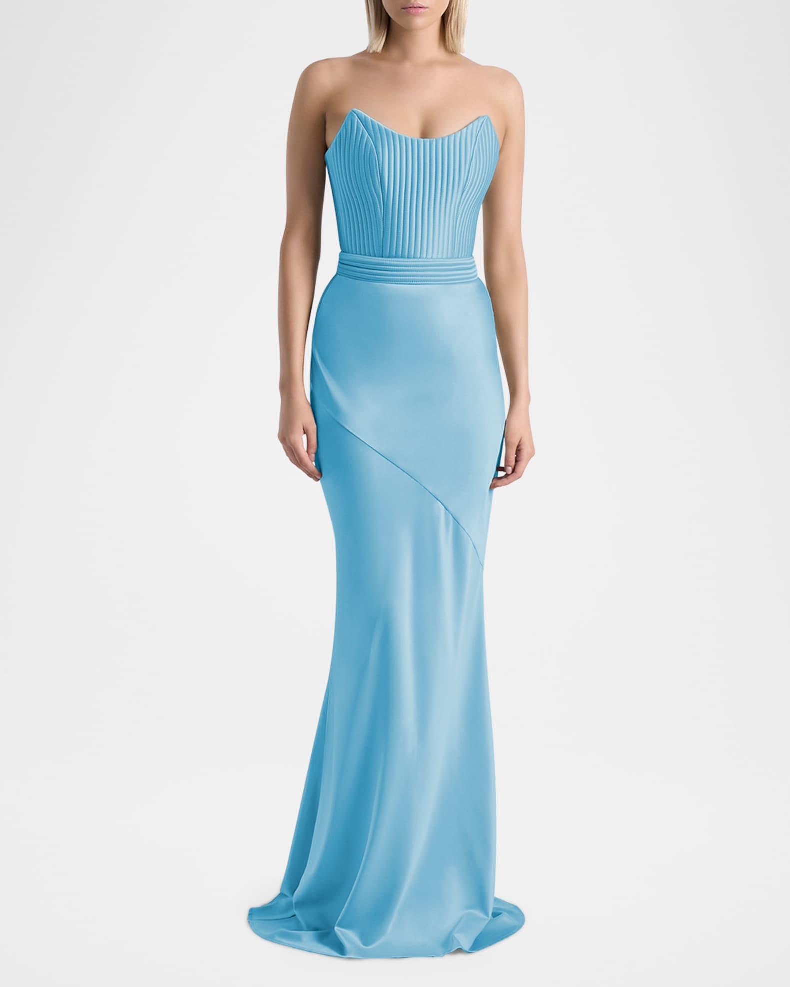 Designed in stretch satin, the "Germaine" gown from ZHIVAGO is elevated with a stitched bodice and waistband and flows into a bias-cut skirt Approx. 63"L from shoulders to hem Strapless peaked neckline Sleeveless Princess seams Floor-sweeping hem Column silhouette Invisible back zipper Polyester Hand wash Imported
