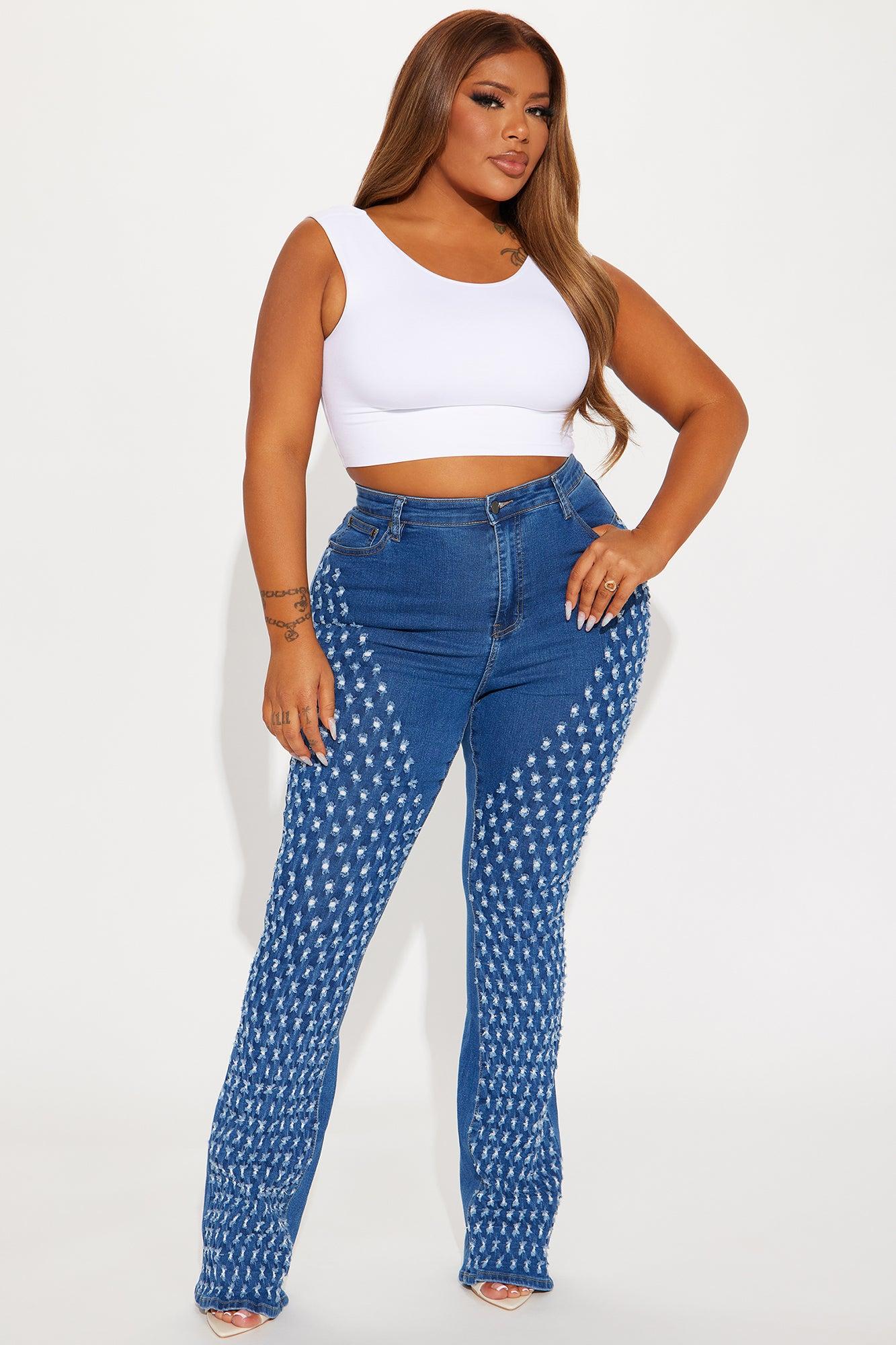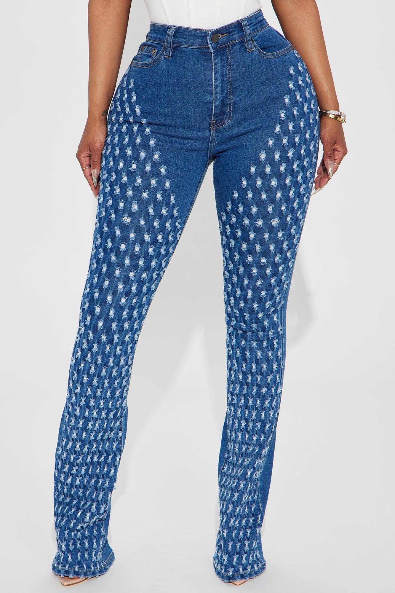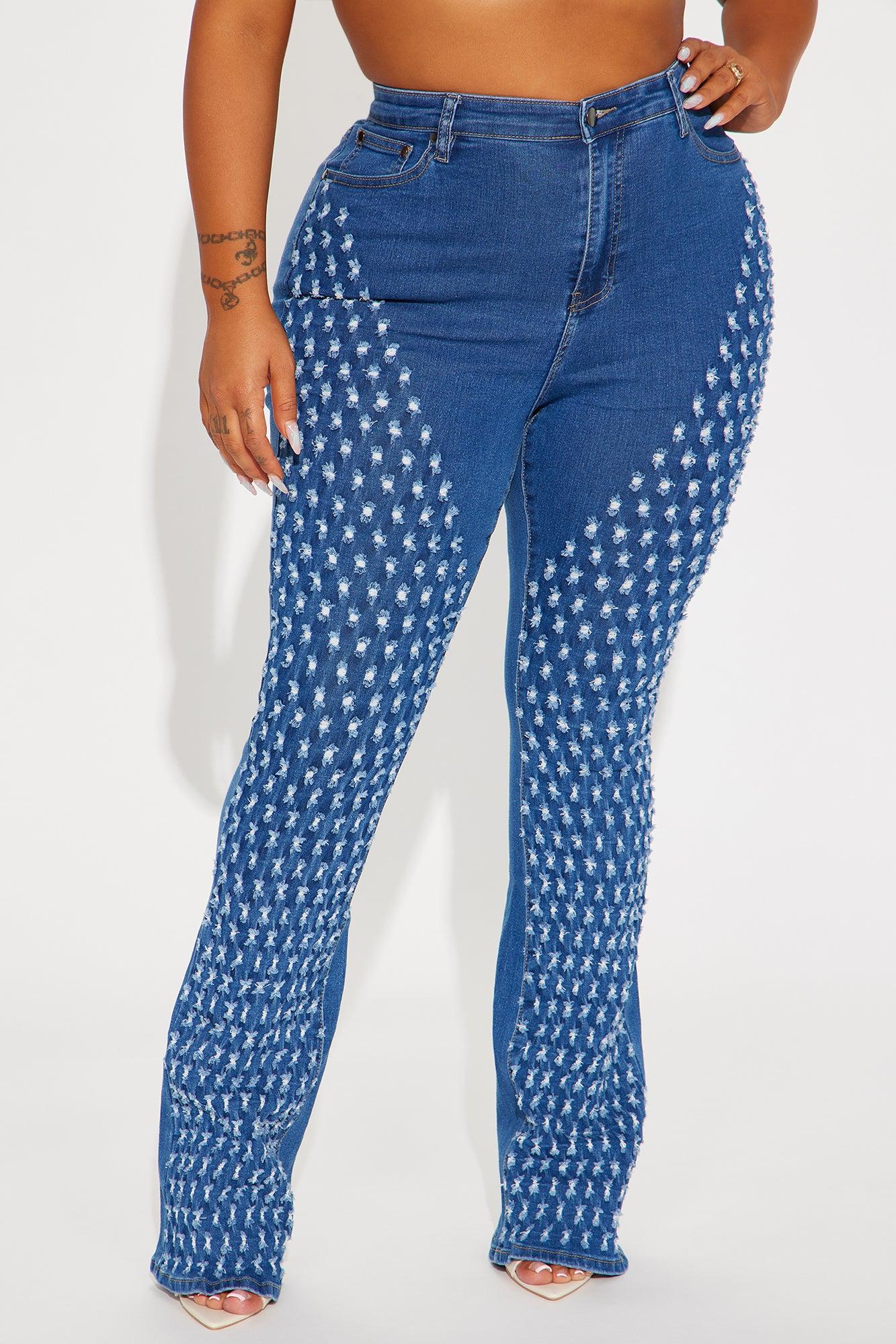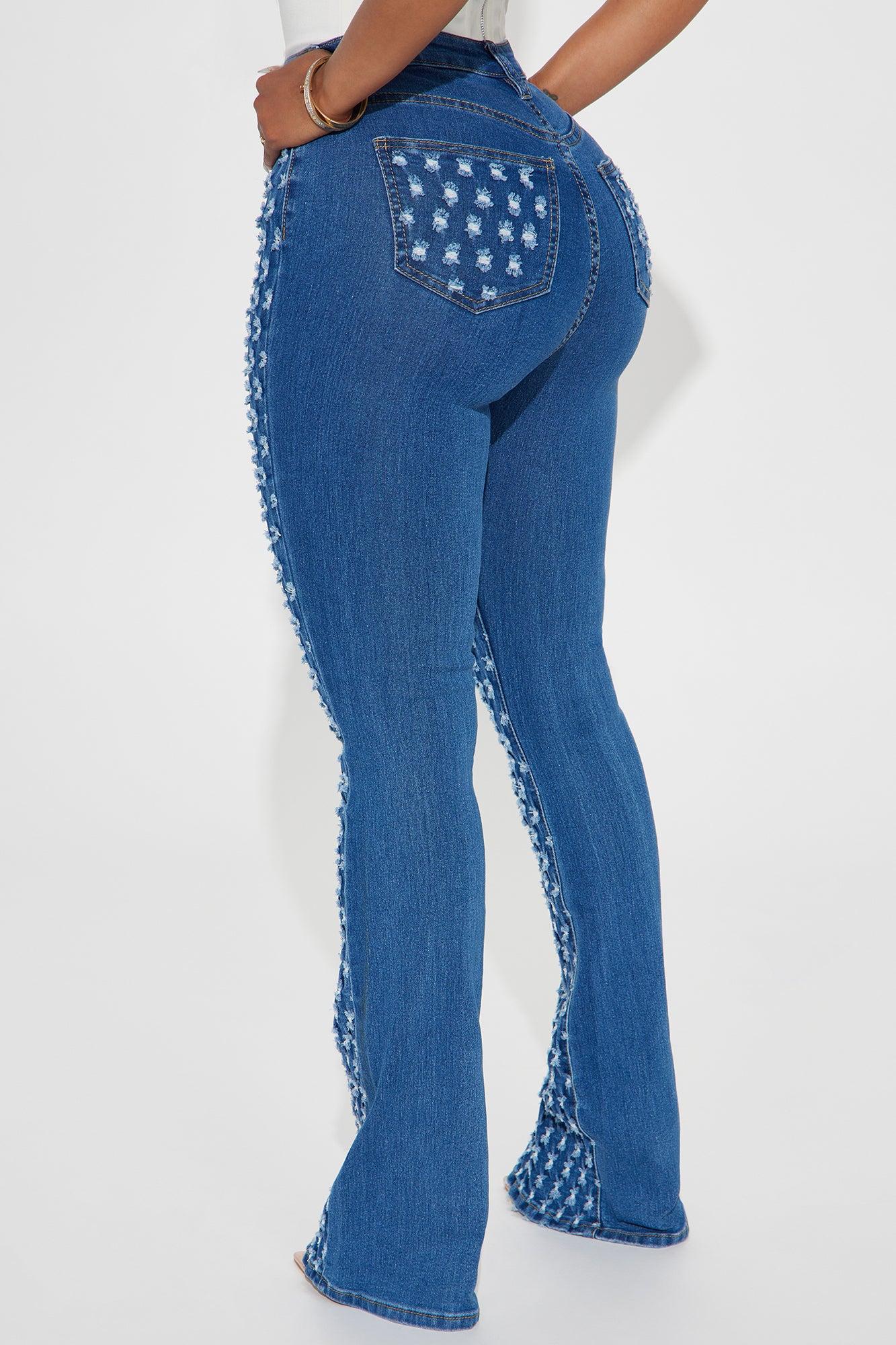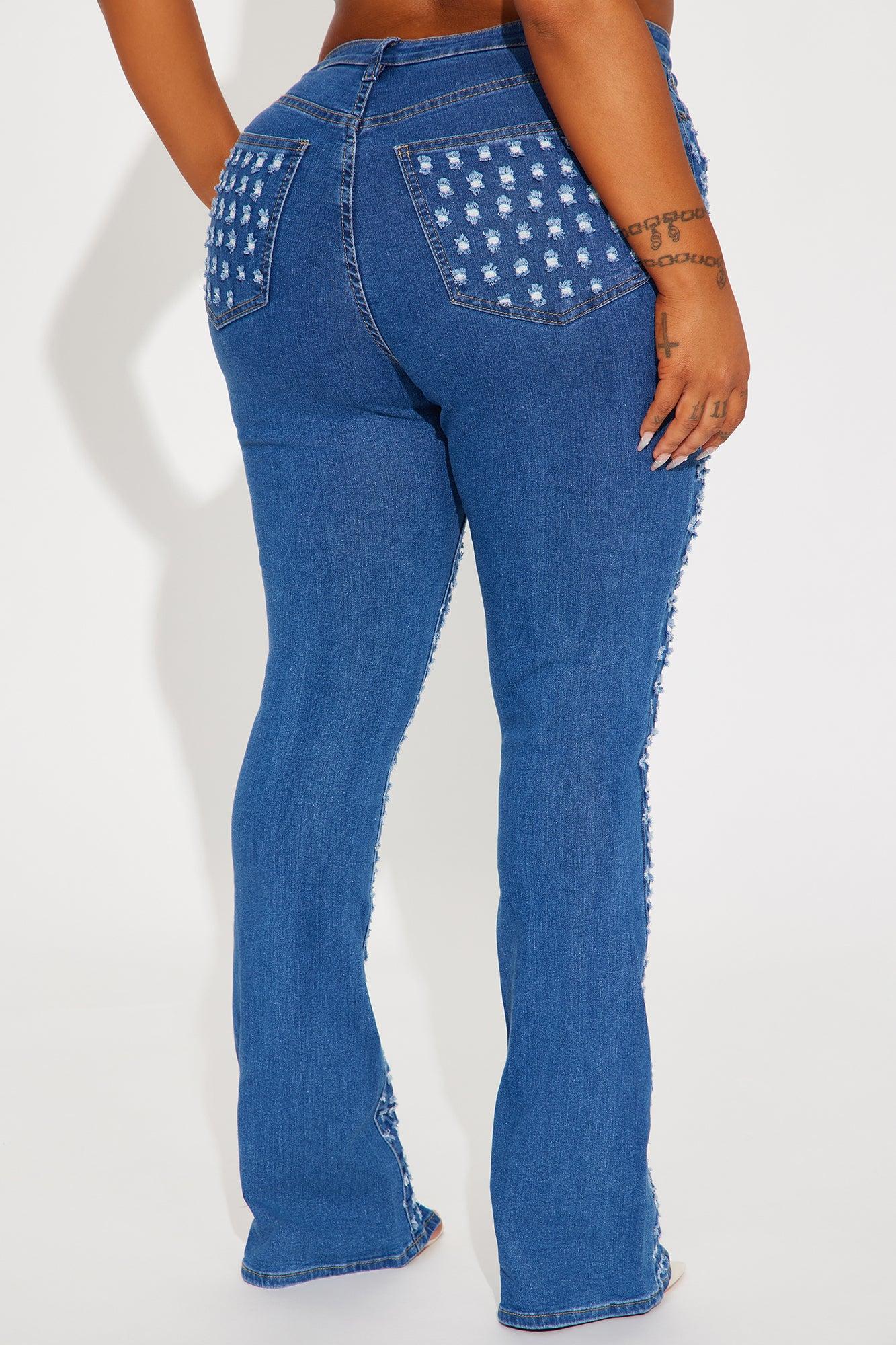 Available In Medium Wash. Flare Jean Pockets Ripped 11" High Rise 34" Inseam High Stretch Disclaimer: Due To The Specialized Wash & Distressing Process, Each Garment Is Unique. 80% Cotton 15% Polyester 5% Elastane Imported California Proposition 65 WARNING: Cancer and Reproductive Harm - www.P65Warnings.ca.gov.