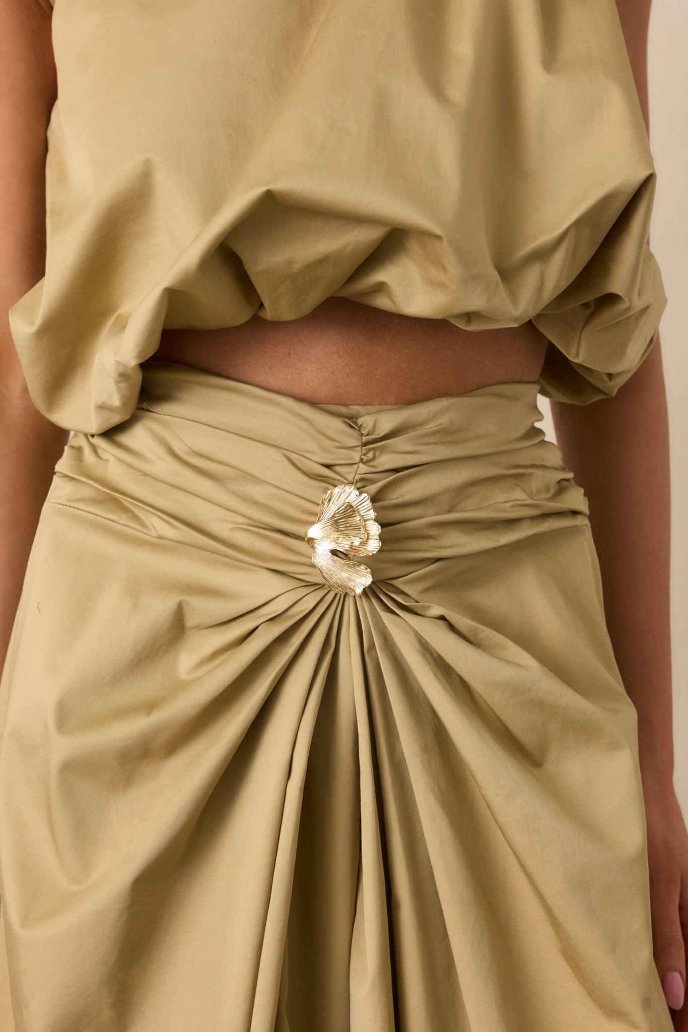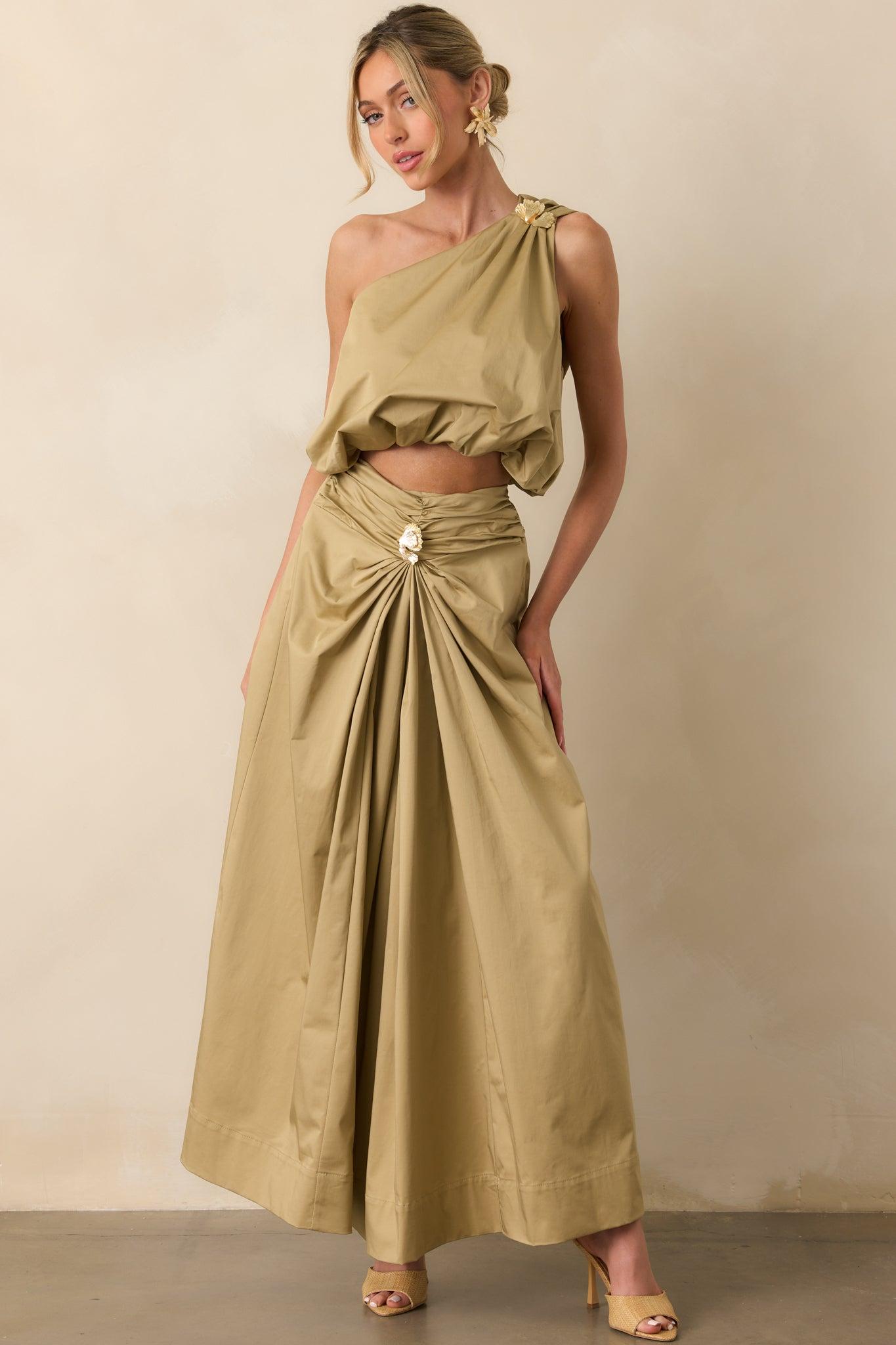 The Get My Good Side Tan Ruched Drape Maxi Skirt is perfect for evenings when you want your outfit to feel sophisticated yet modern. With an elegant flow and eye-catching detail, it’s an ideal choice for dinner plans, parties, or any occasion where you’re ready to make a stylish impression. This tan maxi skirt features a high rise, ruched waistband, 3D textured gold embellishment, draped style front, back elastic waist insert, and a hidden back zipper.
