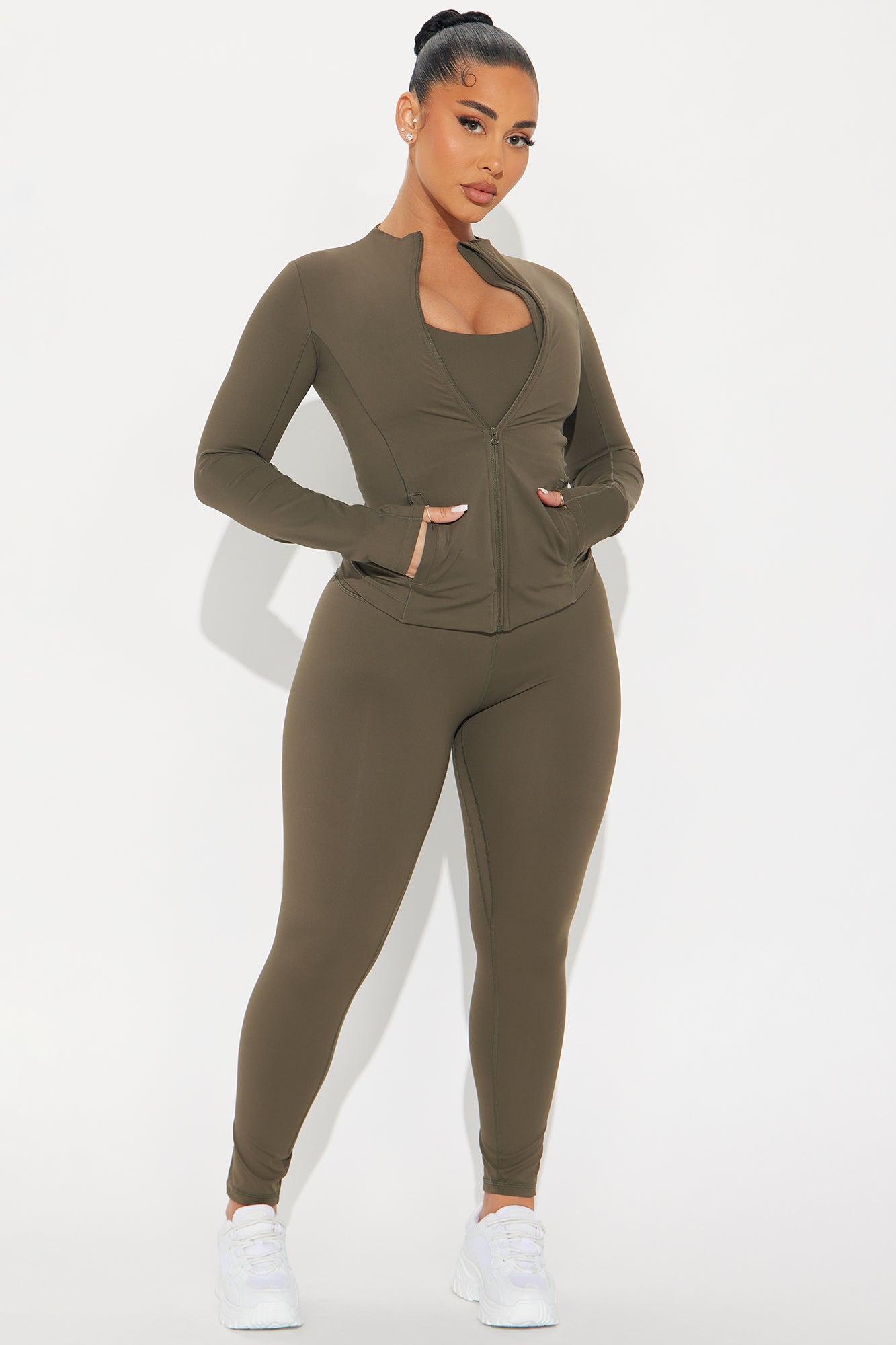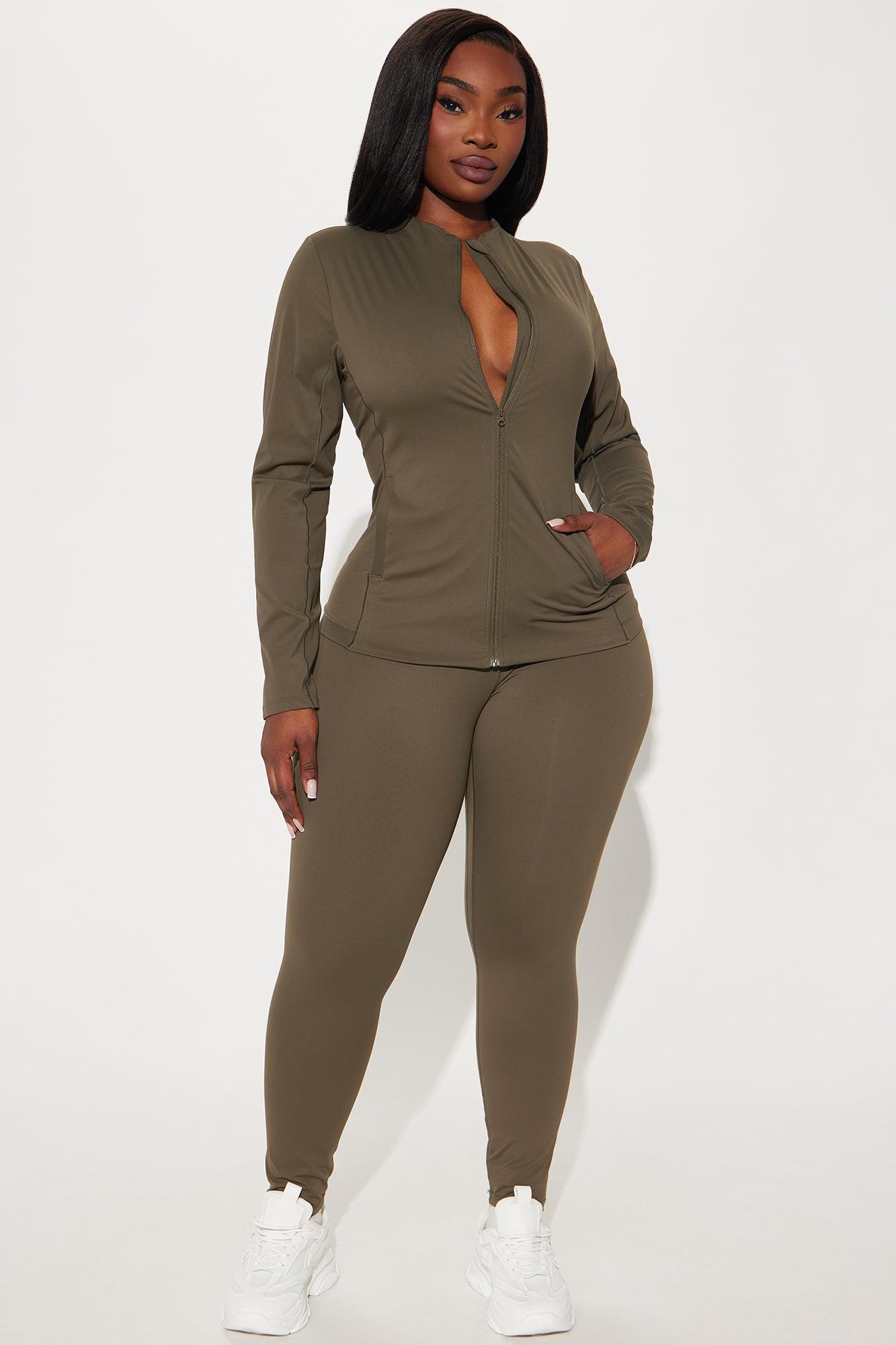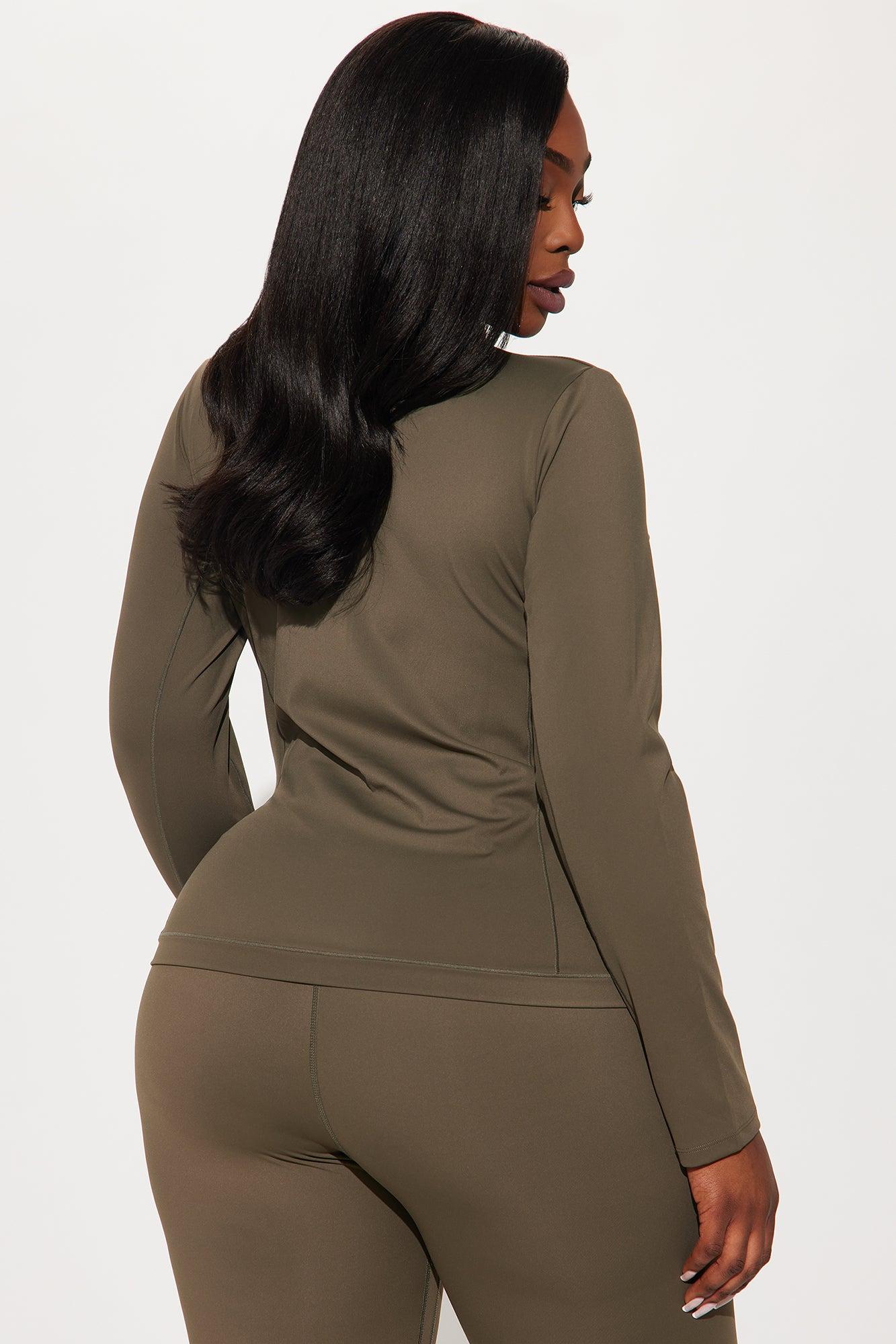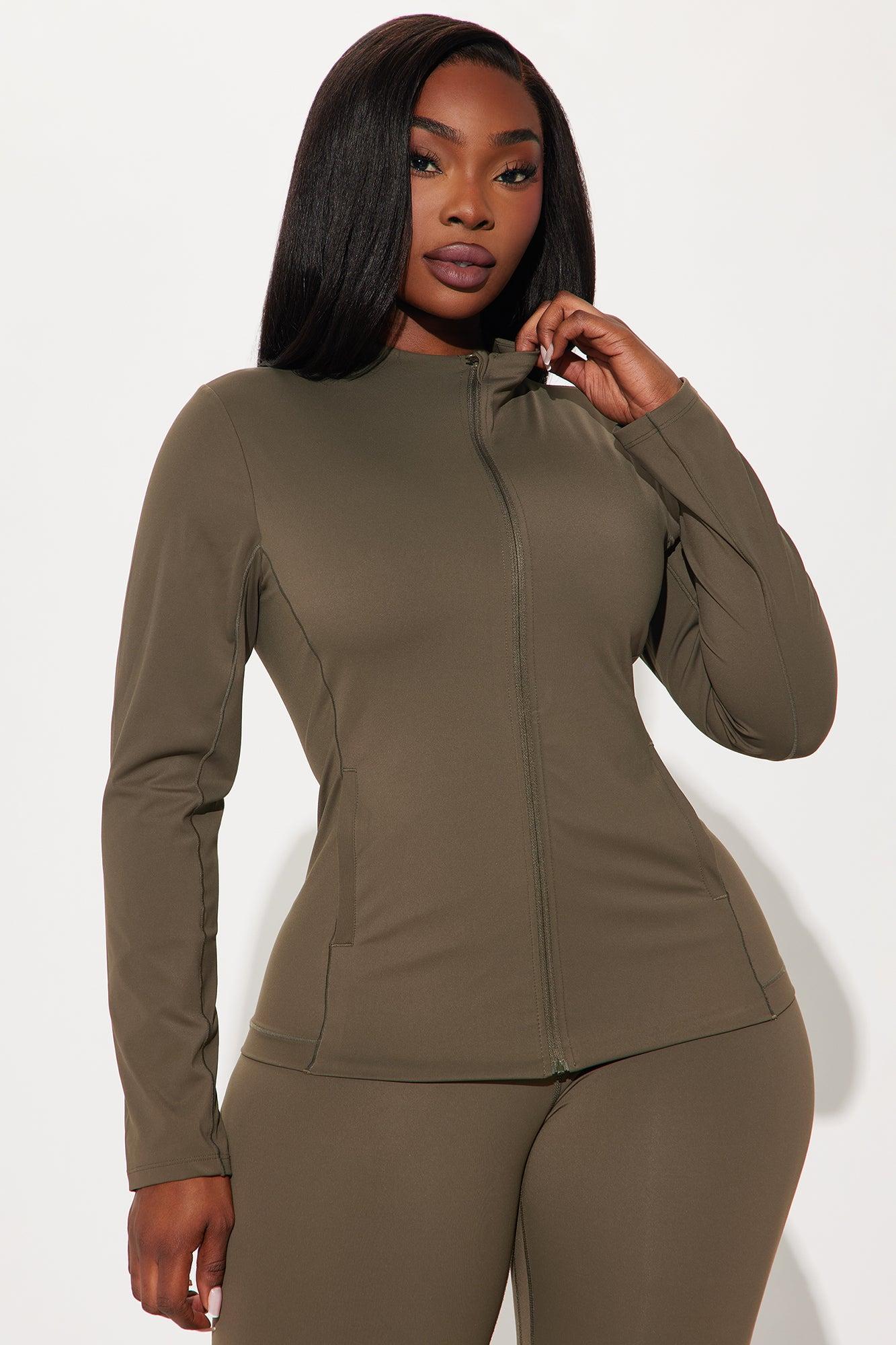 Available In Chocolate And Olive. Active Jacket High Neck Long Sleeves Compression Fabric Seaming Detail Functional Pockets Low Impact Stretch Pair with "Get Right Active Legging" 78% Nylon, 22% Spandex Imported