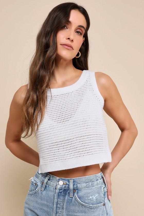 Curate effortless vibes like it's your callingLife is as easygoing as it is cute in this loose-knit tank top with a sleeveless design and wide-cut, scoop neck bodice. The cropped hem finishes with notches at either side for breezy, comfortable wear. Contrasting ribbed knit along the neckline, arm holes, and hem.