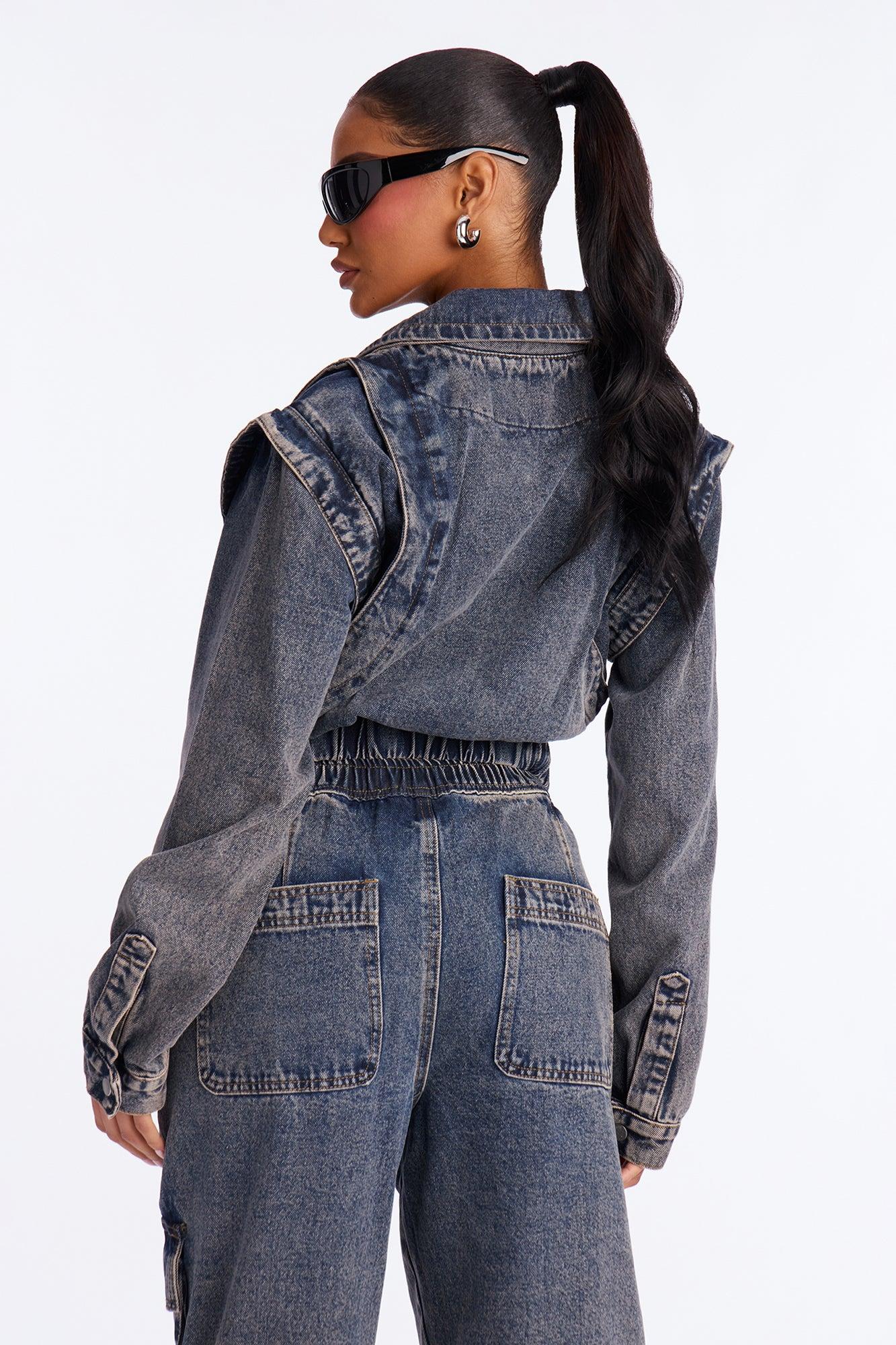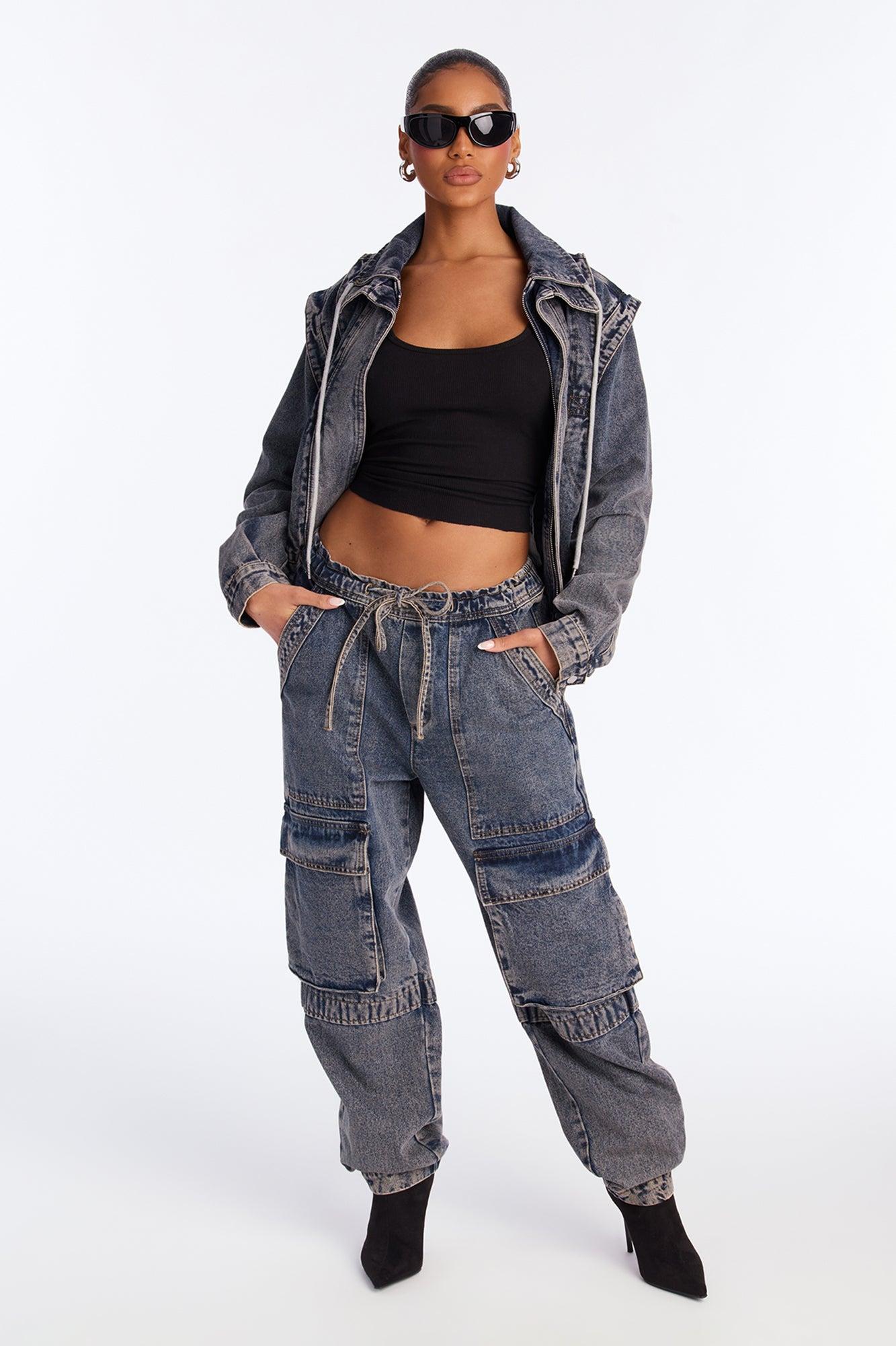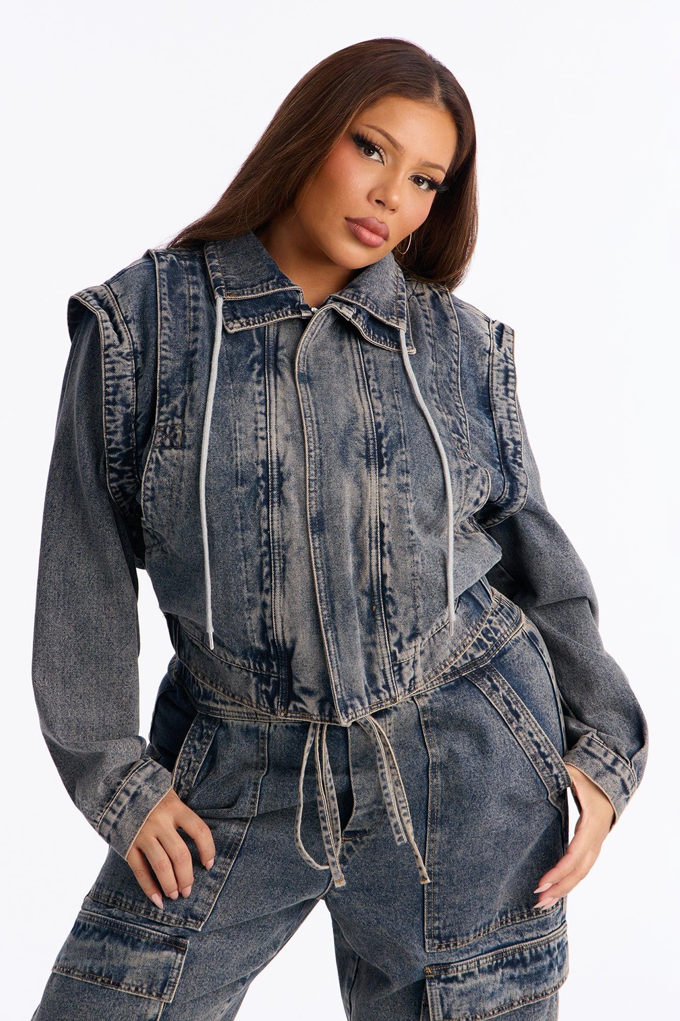 Available In Acid Wash Blue. Denim Jacket Pair With Get To You Cargo Jogger Jeans To Complete The Look! Double Collar Drawstring Zipper Closure Front Pockets Elasticized Hem Non Stretch Disclaimer: Due To The Specialized Wash, Each Garment Is Unique. 85% Cotton 15% Polyester Imported