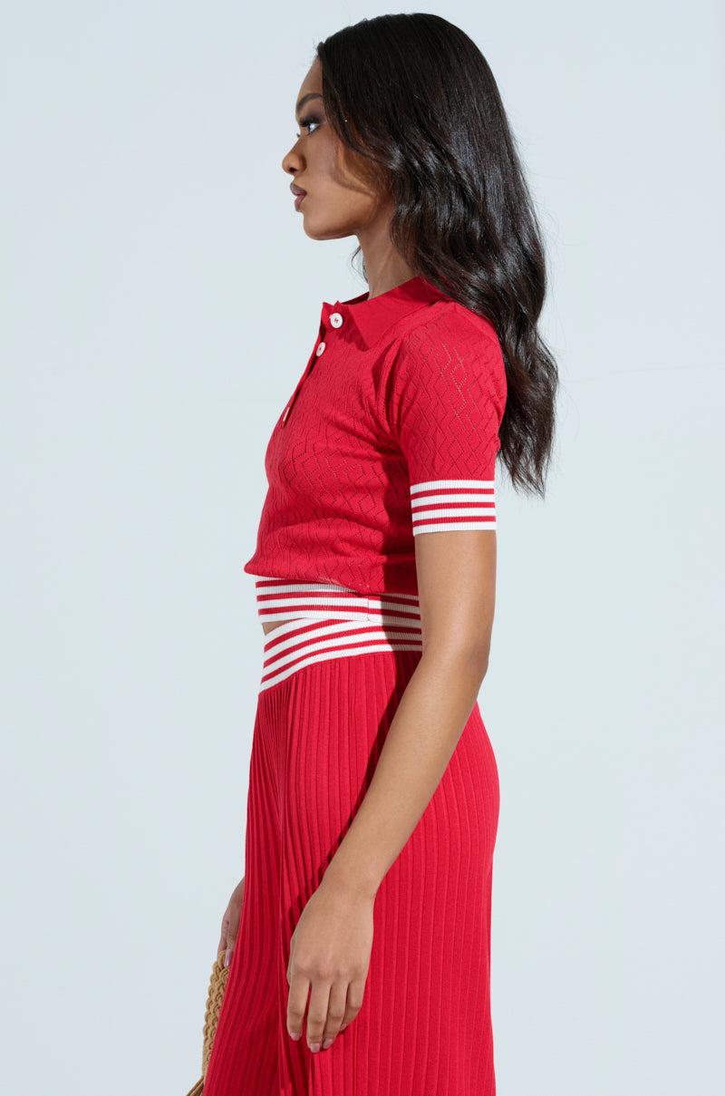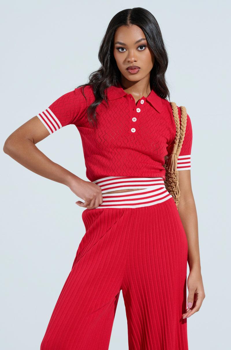 The bar is high in The AKIRA Label Get With It Crop Sweater. This effortless top is crafted from a stretchy knit material and features a subtle cut out diamond pattern throughout, a fold over pointed collar, short sleeves with ribbed knit cuffs with contrast striped detailing, a coordinating bottom hem, and a button front placket. Complete with a cropped silhouette, and an easy, pull-on fit. Pair with the matching AKIRA Label Get With It Relaxed Pant and platform loafers for a finished look. - Shell: 65% Viscose 35% Nylon- Super Stretchy- Imported (all measurements approximate from size small)- 18” Shoulder to Hem- 14” Shoulder to Shoulder- 10” Sleeves- Model is 5’8” and is wearing size smallProduct ID: 1028518 (all measurements approximate from size 1X)- 21” Shoulder to Hem- 16” Shoulder to Shoulder- 12” SleevesProduct ID: 1028522