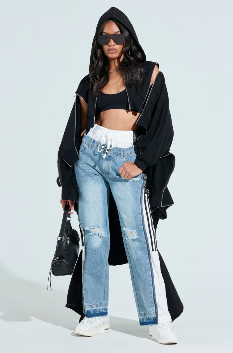 It’s easy to look put together with The AKIRA Label Get With It Pant. These effortless bottoms feature a high rise shirred elastic waistband made from a lightweight base with drawstring closures, and striped accenting with contrast mesh detailing that runs halfway down the sides of the pant legs. It also boasts a light wash denim overlay that creates a unique double waistband silhouette that showcases functional belt loops, distressed detailing throughout, a mock zip-button front closure, and a classic five-pocket design. Complete with a straight leg silhouette, and an easy, pull-on fit. - Self: 90% Cotton 10% Polyester, Contrast: 62% Viscose 30% Polyamide 8% Spandex- Some Stretch- Imported (all measurements approximate from size small) - 13” Rise- 31” Inseam- Model is 5’8” and is wearing size small Product ID: 1025169