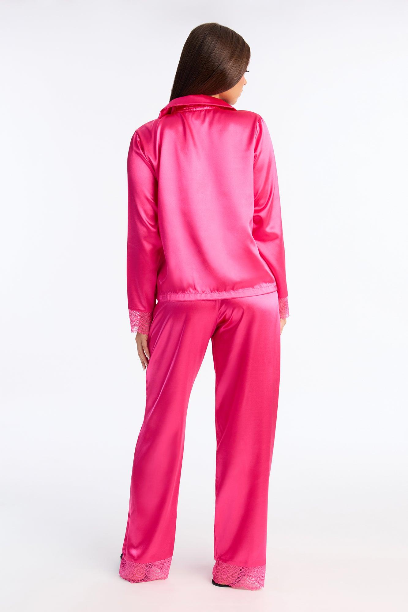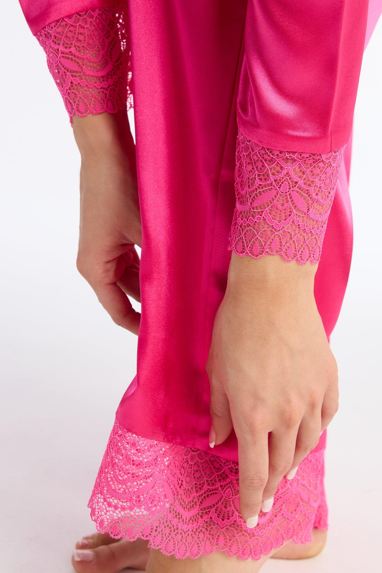 Getting Sleepy Satin Lace Trim Long Sleeve PJ Pant Set - Hot Pink Female