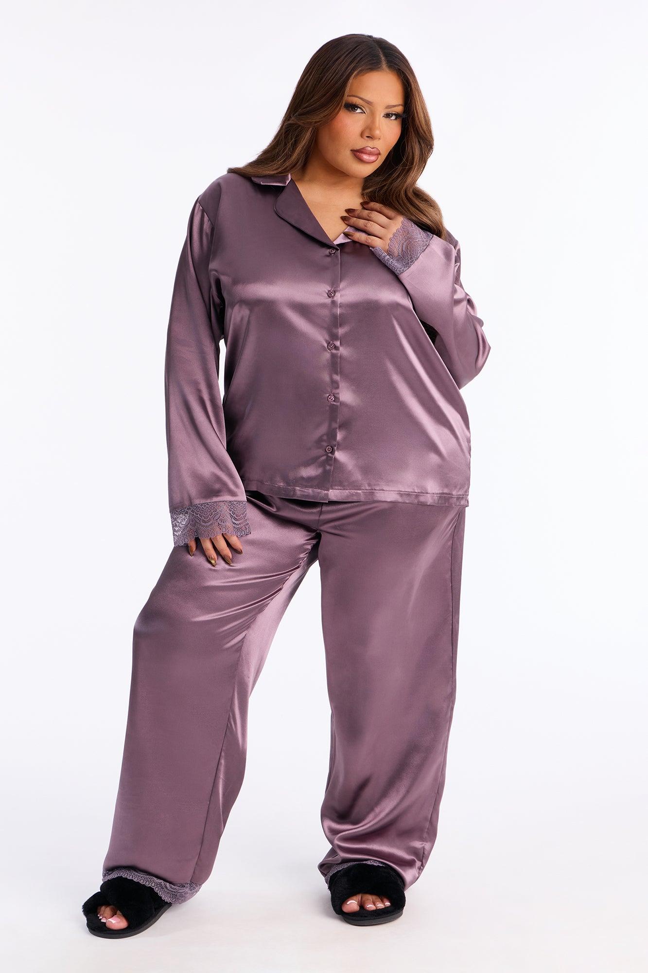 Getting Sleepy Satin Lace Trim Long Sleeve PJ Pant Set - Purple Female