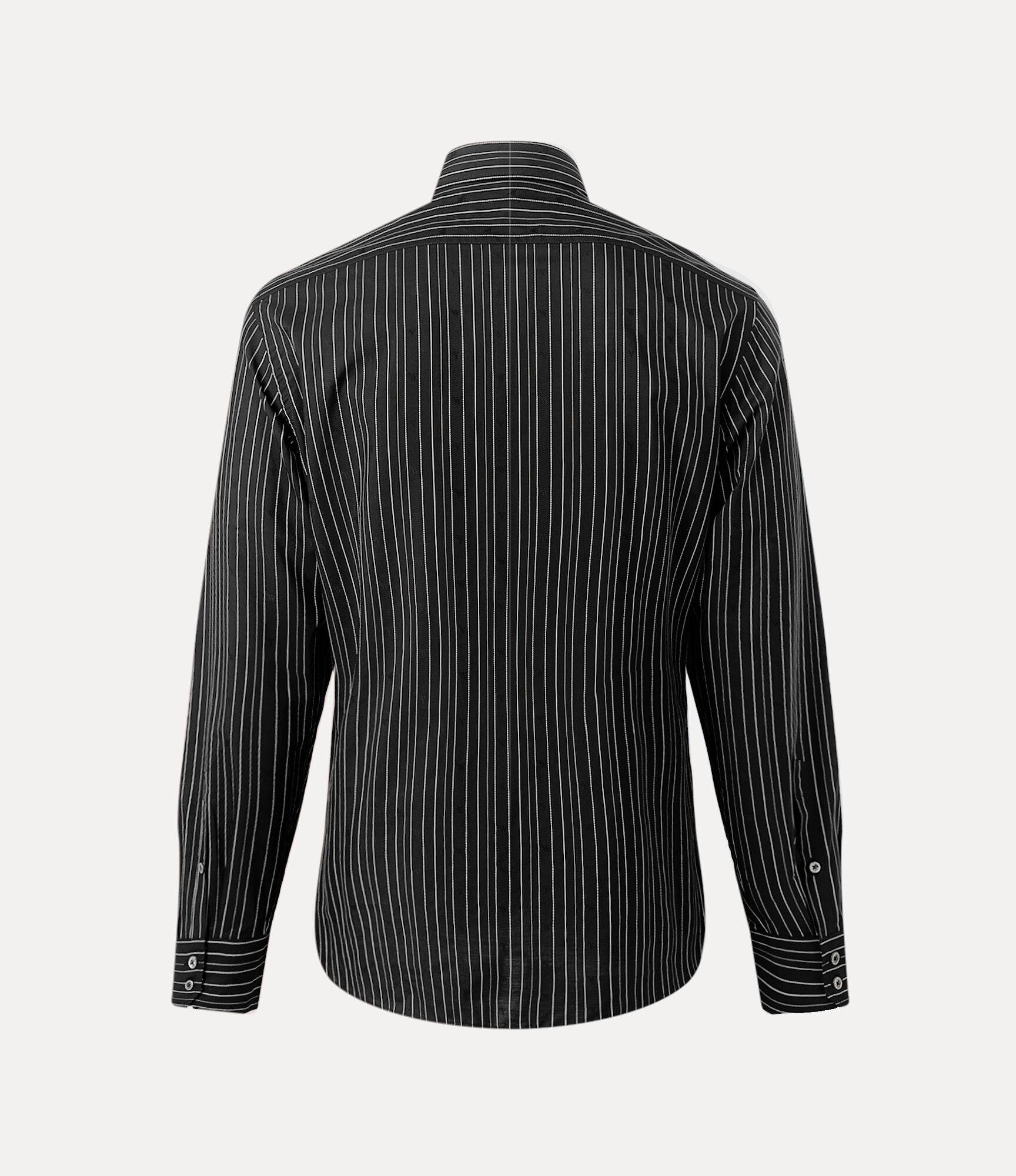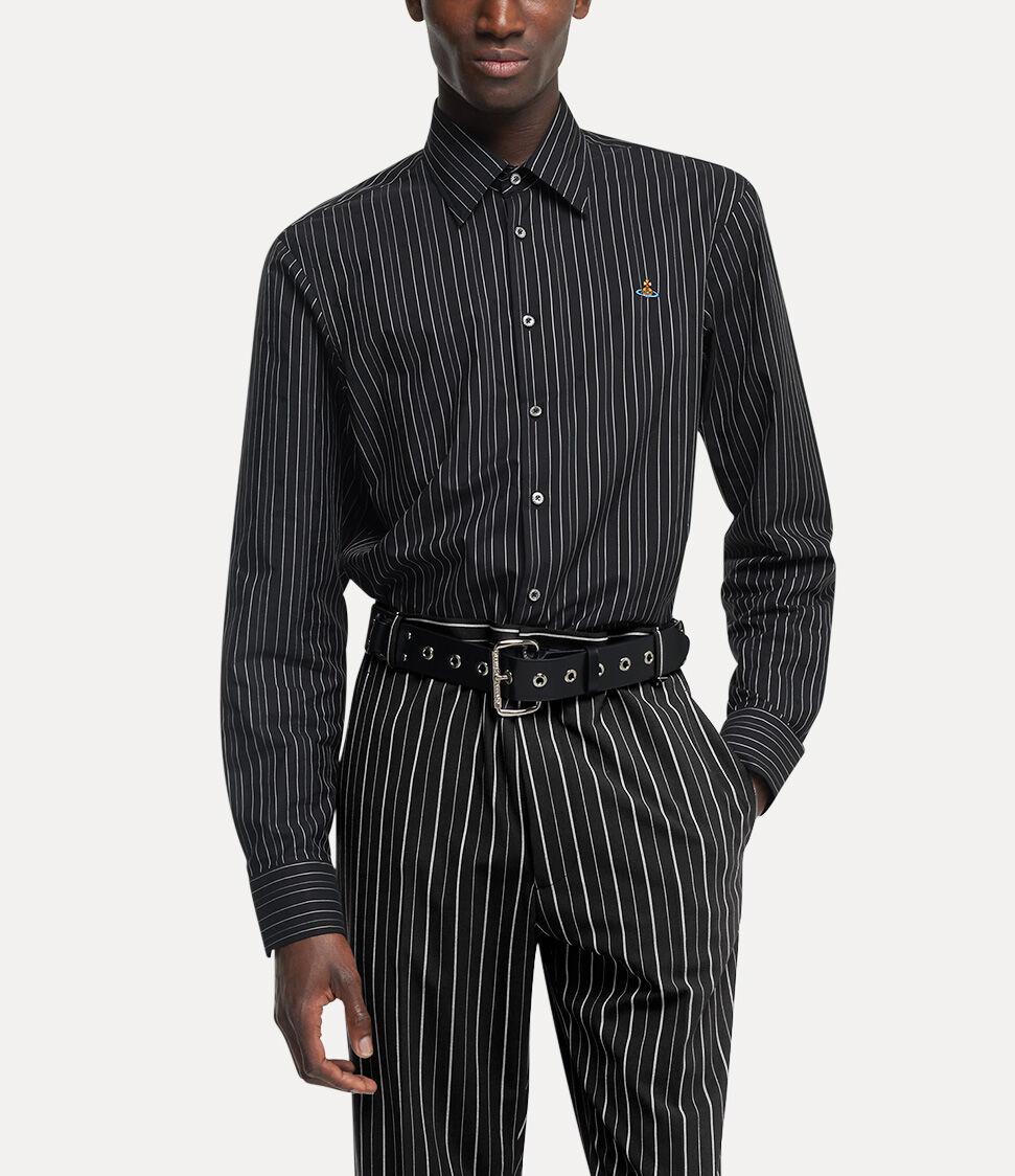 The Ghost shirt adopts a fil-coupe pinstripe motif, which has been developed to include the house's signature Vivienne Westwood logo jacquard. The piece is embroidered with a multicoloured orb on the left-hand side of the chest, synonymous with Vivienne's vision of taking tradition into the future, adorned with this season's engraved mother-of-pearl buttons.