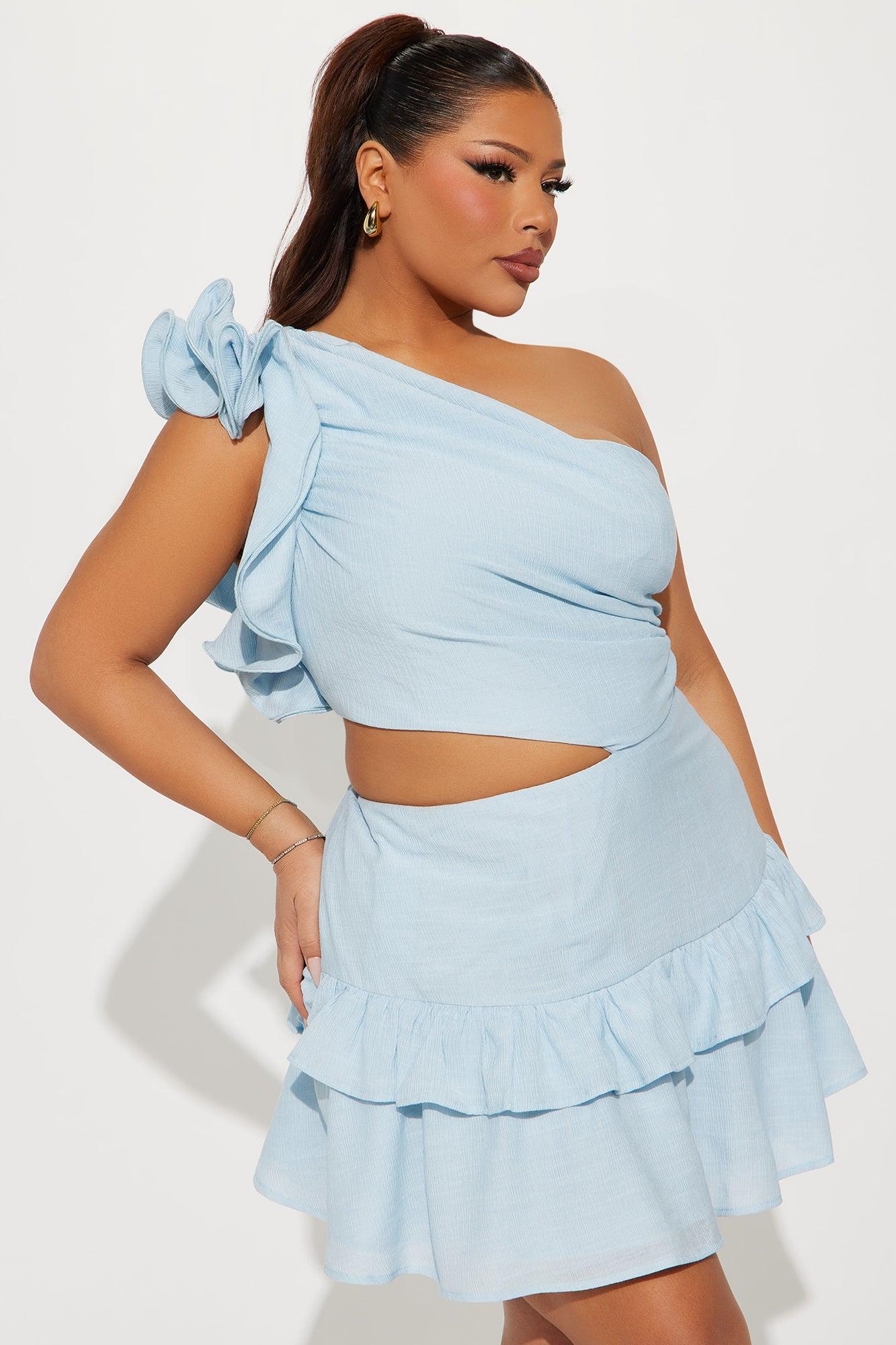 Available In Black And Ice Blue. Tiered Ruffle Mini Dress One shoulder Sleeveless Ruffle detail Ruched Side cut out Tiered skirt Side zipper Lined Stretch Length measured flat = 32" Shell: 82% Rayon 18% Nylon Lining: 100% Polyester