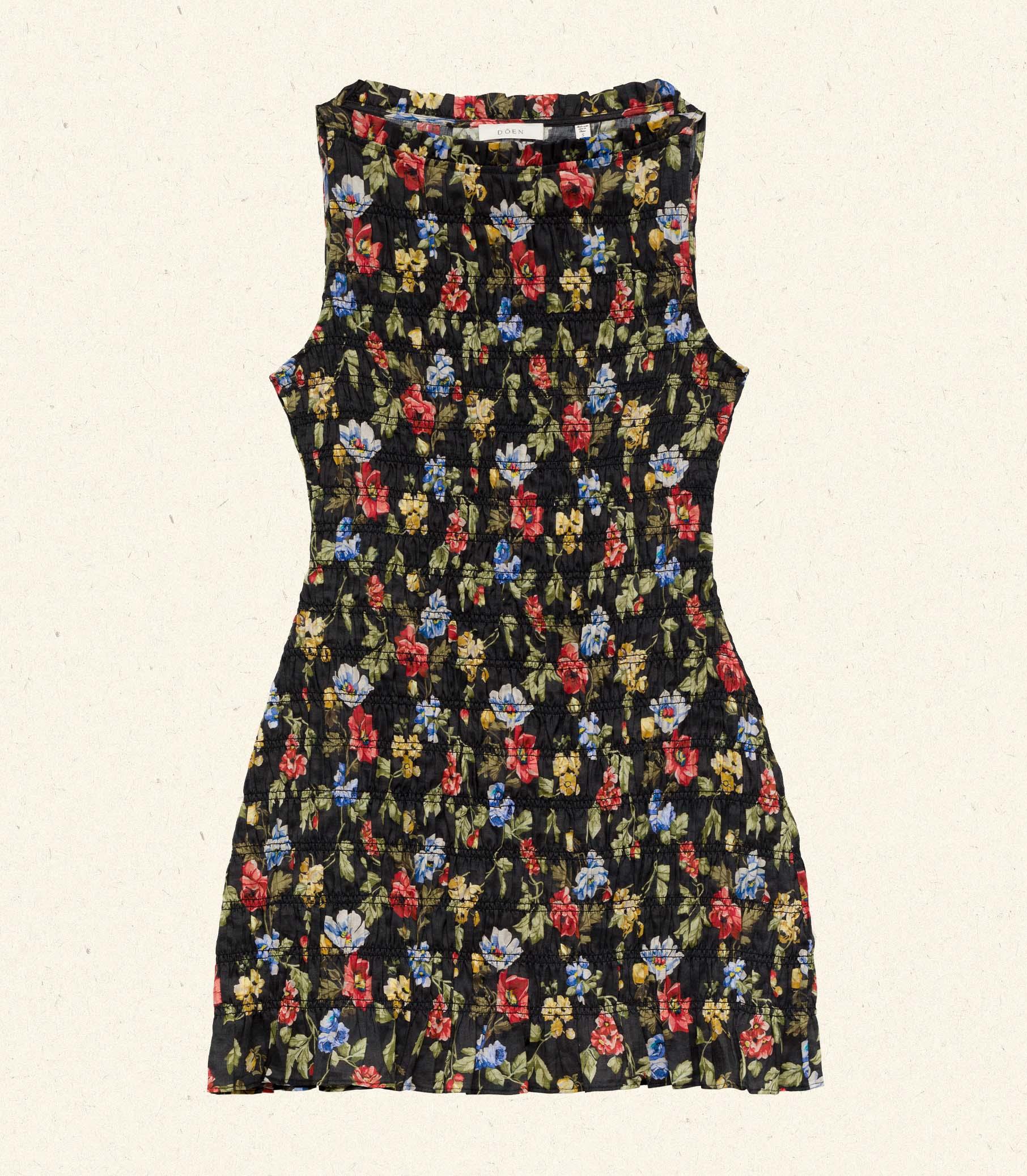 Crafted from a lightweight ramie and rendered in a 1930s French block print, the Gianna Dress is a pullover sleeveless style with a bateau neckline and allover elasticized smocking. A fitted silhouette gives way to a mini-length skirt with a ruffle at the hem.