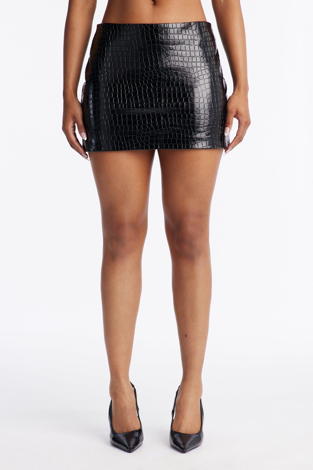Available In Black. Mini Skirt Zipper Closure Low Rise Embossed Croc Patent Faux Leather Non Stretch 11" Length Pair With "Gianna Fitted Faux Leather Blazer" Self: 100% Viscose with Polyurethane Coating Lining: 100% Polyester Imported California Proposition 65WARNING: Cancer and Reproductive Harm - www.P65Warnings.ca.gov.