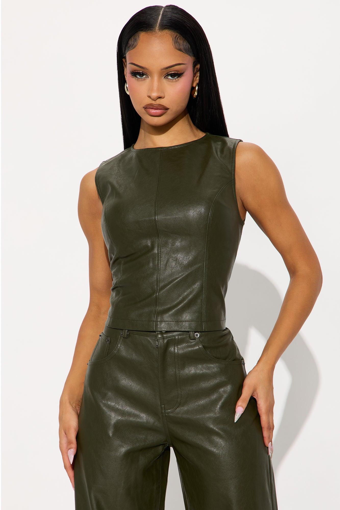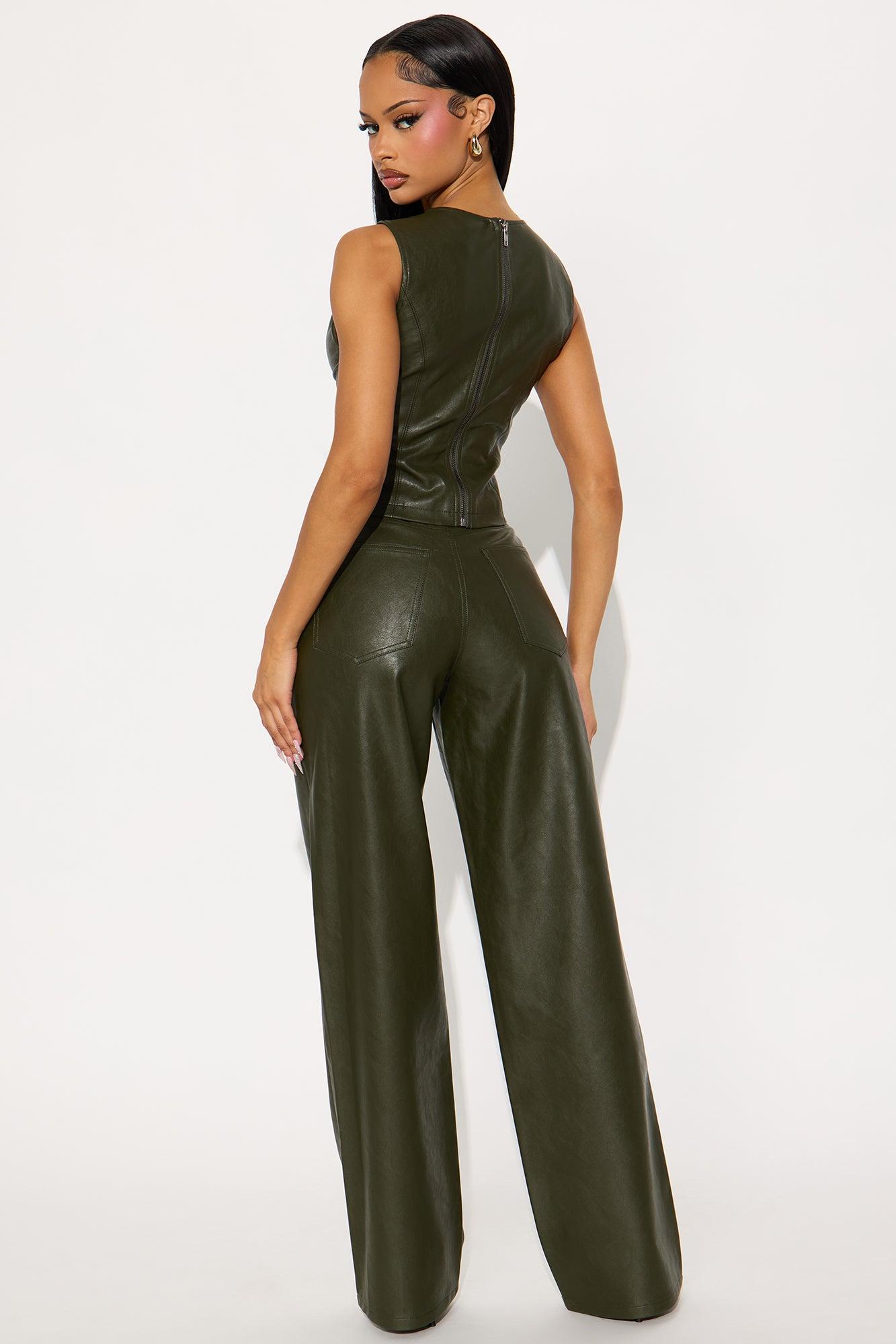 Available In Olive And Plum. 2 Piece Ensemble Tank Top And Wide Leg Pant Set Stretch 33.5" Inseam Front Button And Zipper Pant Closure Pockets Self: 55% Polyester 45% Polyurethane Lining: 100% Polyester Imported California Proposition 65WARNING: Cancer and Reproductive Harm - www.P65Warnings.ca.gov.