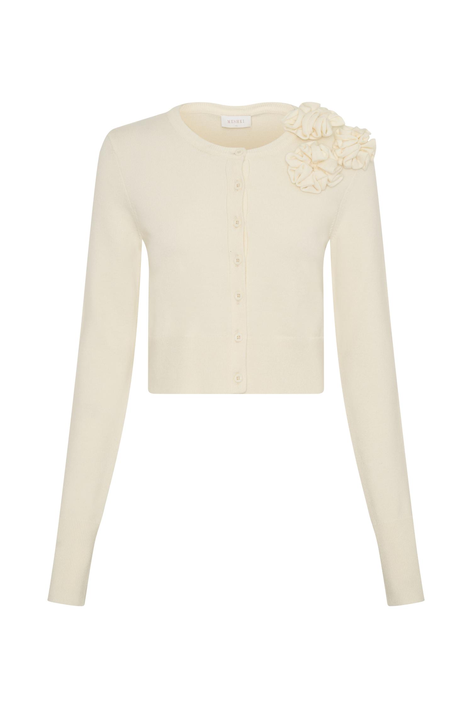 Petals of comfort. Embrace cosy elegance with the GIANNA Knit Cardigan with Flowers. This delightful piece features a classic crew neckline and a button front closure, making it easy to layer over any outfit. The ribbed waist provides a flattering fit, while the long, straight sleeves add a touch of sophistication. Adorned with beautiful flower details at the shoulder and cropped length, this cardigan brings a playful yet refined element to your look.