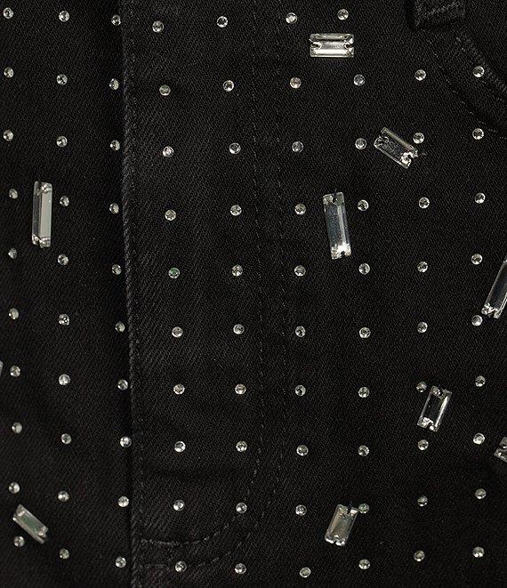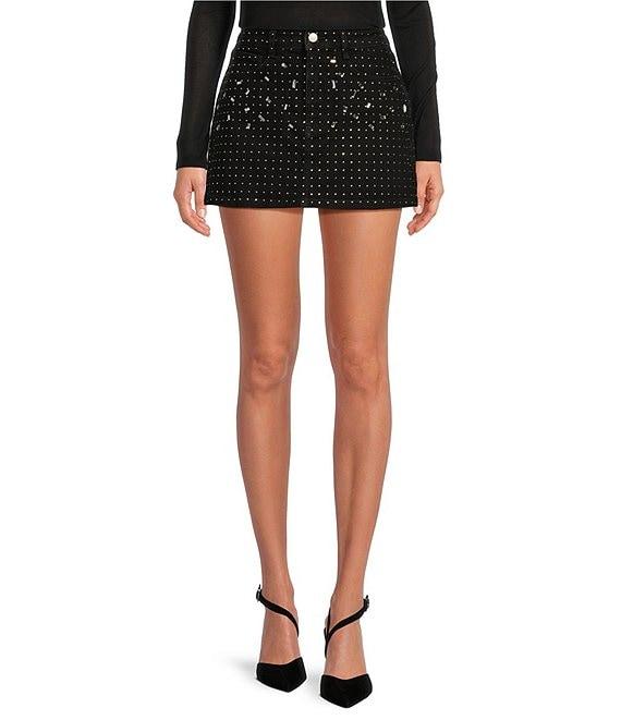 From Gianni Bini, this skirt features: denim fabrication high rise waistline belted loops for styling faded black wash sparkle rhinestone detail front split opening at hemline front button with zipper closure approx.14" from shoulder to hem cotton, elastane dry clean only Imported.