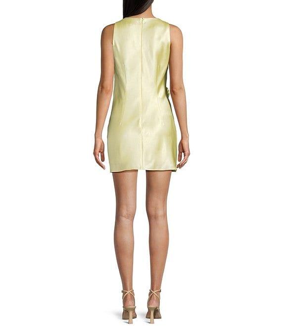 From Gianni Bini, this dress features: Stretch satin fabrication Round neckline Sleeveless Cutout details 3D rosette details Back zipper closure with hook & eye Fully lined Approx. 30.5" in length Polyester Dry clean Imported. Dillard's Exclusive.