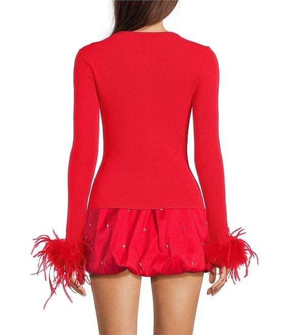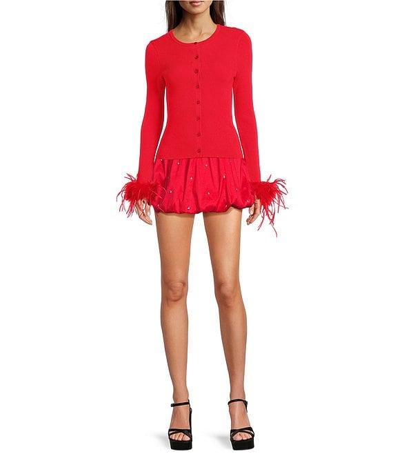 From Gianni Bini, this sweater features: Rayon/nylon fabrication Cardigan silhouette Crew neckline Long sleeves Feather trim detail at cuff Straight hemline Button front closure Approx. 21" in length Rayon/nylon Feather: Ostrich (China) Spot clean only Imported. Dillard's Exclusive.