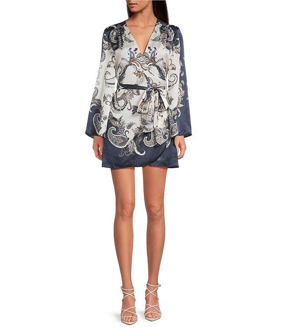 Gianni Bini Jenni Paisley Printed Satin V-Neck Long Sleeve Mini Wrap Dress