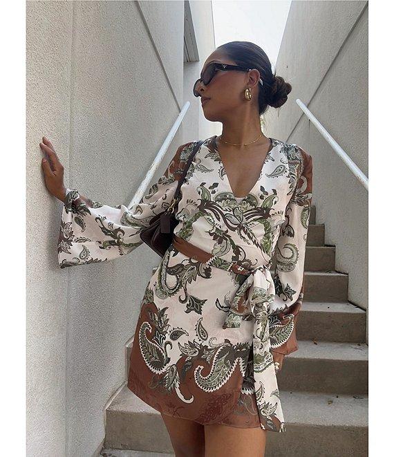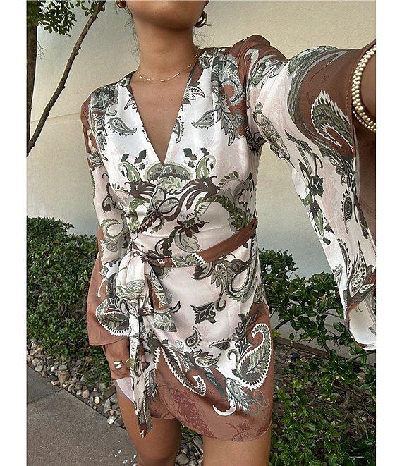 Gianni Bini Jenni Paisley Printed Satin V-Neck Long Sleeve Mini Wrap Dress