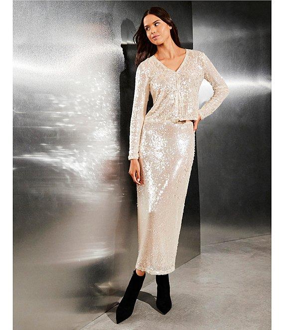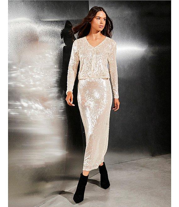 From Gianni Bini, this cardigan features: sequin fabrication v-neckline long sleeves fully lined tie closure approx. 20.25" from shoulder to hem polyester, elastane dry clean Imported.