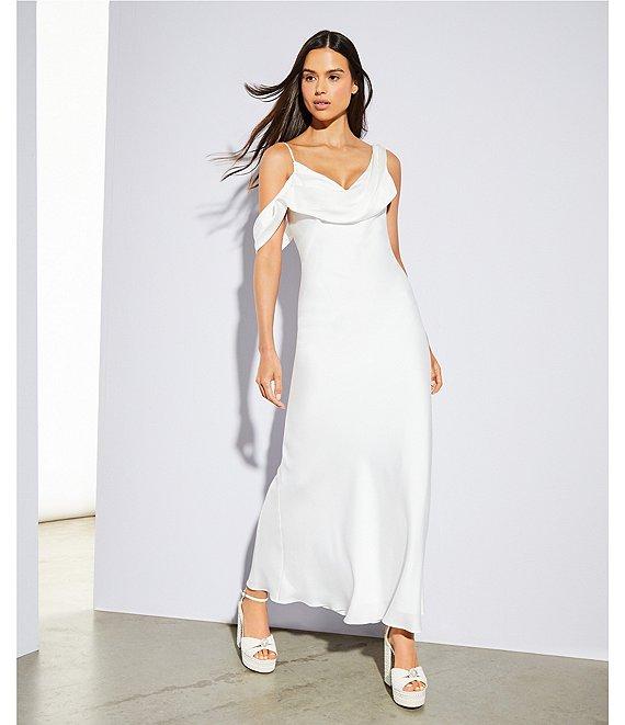 From Gianni Bini, this dress features: Satin fabrication A-line silhouette Asymmetrical neckline Sleeveless Invisible side zip Approx. 59" length Polyester Dry clean Imported.