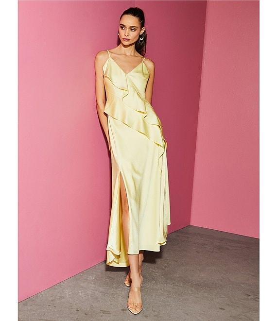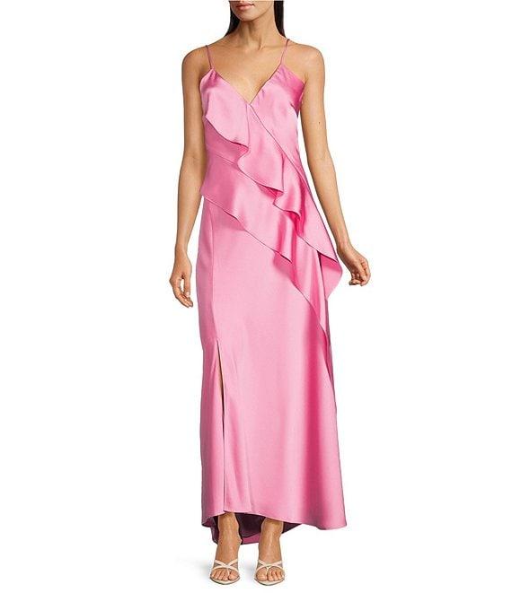 Gianni Bini Quinn Ruffle Draped V-Neck Sleeveless Satin Dress