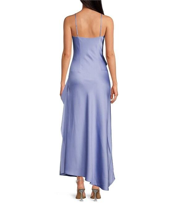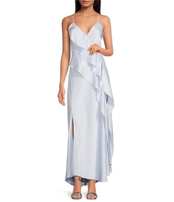 From Gianni Bini, this dress features:Drapey satin fabricationV-necklineSleevelessRuffle bodice detailInvisible side seam zipper closureApprox. 52.5" in lengthPolyesterDry cleanImported.