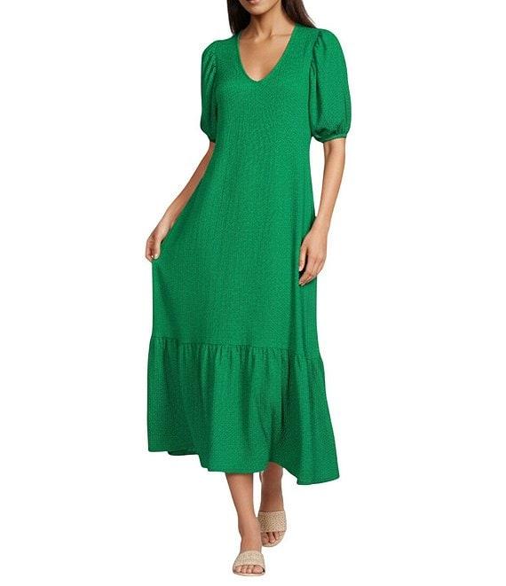 From Gibson & Latimer, this dress features: V-neckline Short puffed sleeves Tie back detail Ruffled hemline Approx. 48.75" in length Polyester/spandex Machine wash/tumble dry Imported.