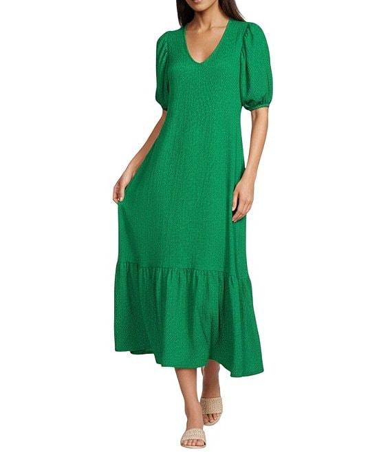 Gibson & Latimer Crepe Waffle Knit V-Neck Tie Back Detail Puffed Short Sleeve Tiered A-Line Flounce Midi Dres