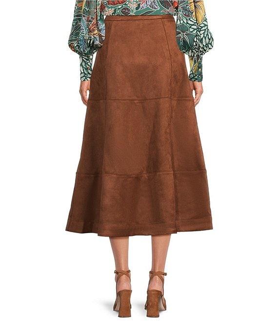 From Gibson & Latimer, this skirt features: Faux suede fabrication High rise waistline Pull on construction Side zipper closure Panel seam detail A-line silhouette Classic fit Flounce hemline Midi length Approx. 37" HPS in length Polyester, Spandex Professional dry cleaning only Imported. Dillard's Exclusive