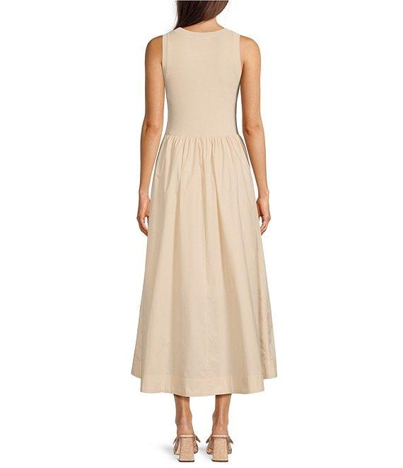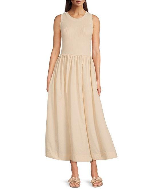 From Gibson & Latimer, this dress features: Mixed Media Construction Ribbed Knit Bodice FabricationWoven Dress Skirt FabricationJewel NecklineSleevelessPullover Construction Fit and Flare SilhouetteSide Seam PocketsFlounce HemlineMaxi Length Approx. 52" HPS in LengthBodice: Rayon, Nylon, SpandexDress Skirt: CottonMachine wash on delicate cold cycle, wash with similar colors, promptly remove from wash, lay flat to dry and reshape. Imported.Dillard's Exclusive