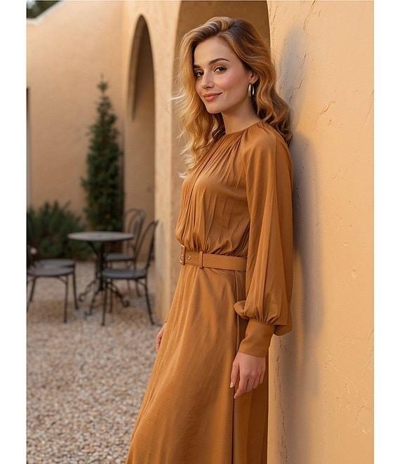 From Gibson & Latimer, this dress features: Moonshadow satin fabrication Blouson silhouette Crew neckline Long sleeves with tall banded cuff Ruched Belted Fully lined Straight hemline Maxi length Button back keyhole closure Approx. 55" HPS in length Polyester Remove belt prior to wash, turn garment inside out prior to wash, wash on cold gentle cycle, wash with similar colors and fabrications, tumble dry on low, and use warm steam iron as needed. Imported. Dillard's Exclusive