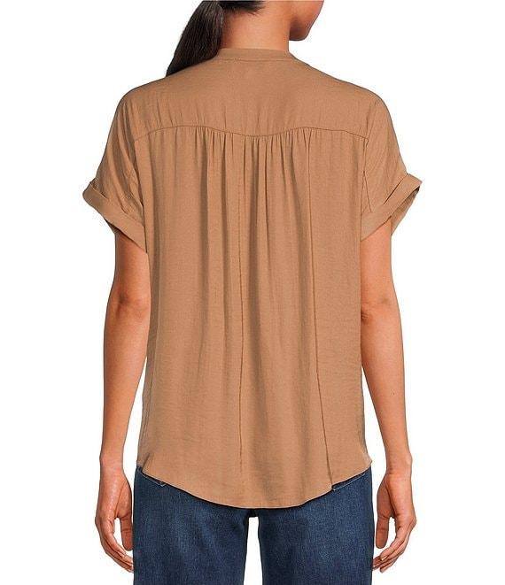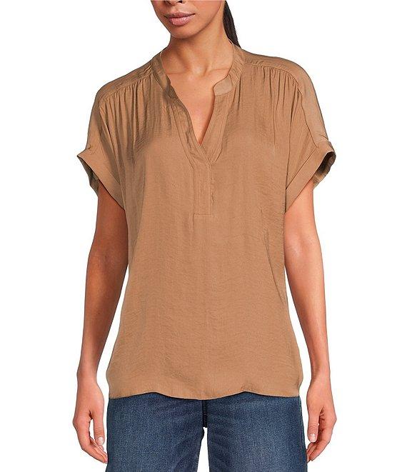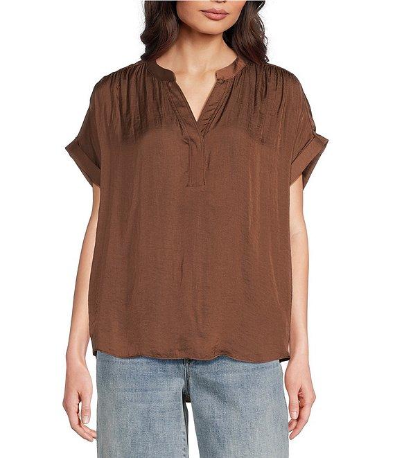 From Gibson & Latimer, this blouse features: Moonshadow Satin Fabrication Band Split Round Neckline Pullover Construction Dropped Shoulder Short Sleeve with Roll Tab Cuff Blouse Silhouette Classic Fit Unlined High-Low Shirttail Hemline Average Length Approx. 25.75" length Polyester Machine wash on cold cycle, wash with similar colors and fabrications, promptly remove from wash, tumble dry on low, use cool steam iron if needed. Imported.
