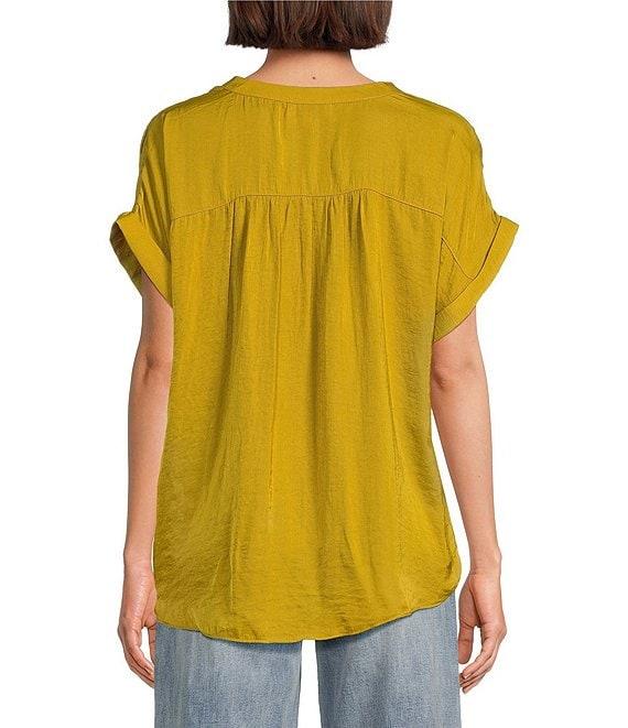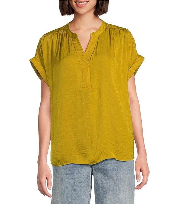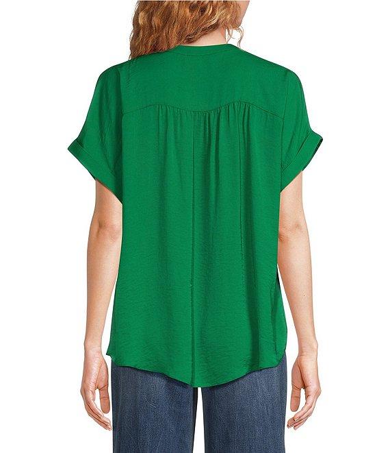 From Gibson & Latimer, this blouse features: Moonshadow Satin Fabrication Band Split Round Neckline Pullover Construction Dropped Shoulder Short Sleeve with Roll Tab Cuff Blouse Silhouette Classic Fit Unlined High-Low Shirttail Hemline Average Length Approx. 25.75" length Polyester Machine wash on cold cycle, wash with similar colors and fabrications, promptly remove from wash, tumble dry on low, use cool steam iron if needed. Imported.