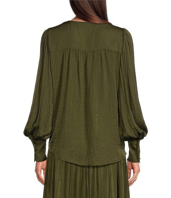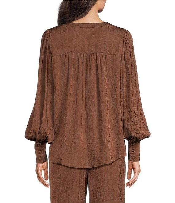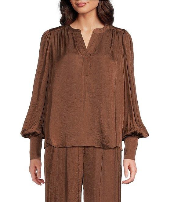 From Gibson & Latimer, this blouse features: Moonshadow satin fabrication Banded split round neckline Long cuffed balloon sleeve with ruched shoulders Classic fit Shirttail hemline Pullover construction Approx. 25.75" HPS in length Polyester Turn garment inside out prior to wash, machine wash on cold gentle cycle, wash with similar colors. tumble dry on low. use cool steam iron if needed. Imported. Dillard's Exclusive.