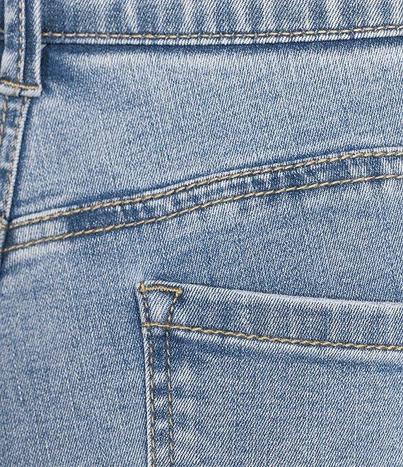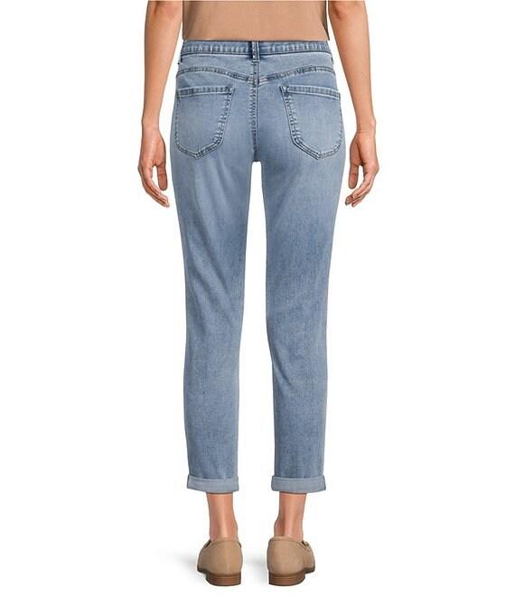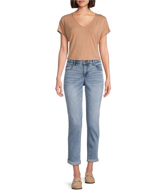 From Gibson & Latimer, these jeans feature: Stretch denim fabrication Perfect fit no gap waist Sculpts & contours Hidden poly power mesh slimming panel Mid-rise waistline Elastic waistband Functional front and back pockets Skinny leg silhouette Cropped length Rolled cuff straight hemline Front button with zipper closure Approx. 26" inseam Cotton/polyester/rayon/lycra spandex Machine wash on cold cycle; wash with similar colors and fabrications/promptly remove from wash; tumble dry on low cycle; use cool iron if needed Imported. Dillard's Exclusive