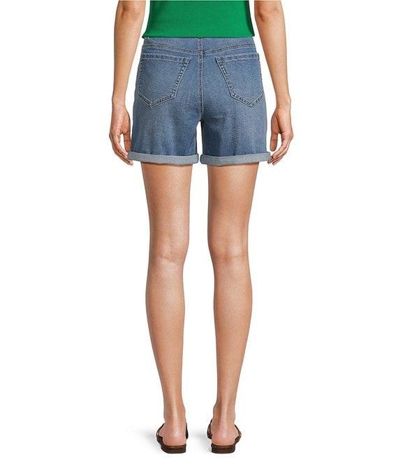 From Gibson & Latimer, these shorts feature: Worn wash Denim twill fabrication High stretch & recovery fabrication Power mesh slimming pannel High rise waistline Elastic waistband for perfect fit Pullon construction Front button with zipper closure 5 pocket short silhouette Rolled cuff Straight hemline Approx. 5" inseam Cotton/polyester/rayon/lycra Machine wash/wash with similar colors and fabrications/tumble dry on low Imported. Dillard's Exclusive