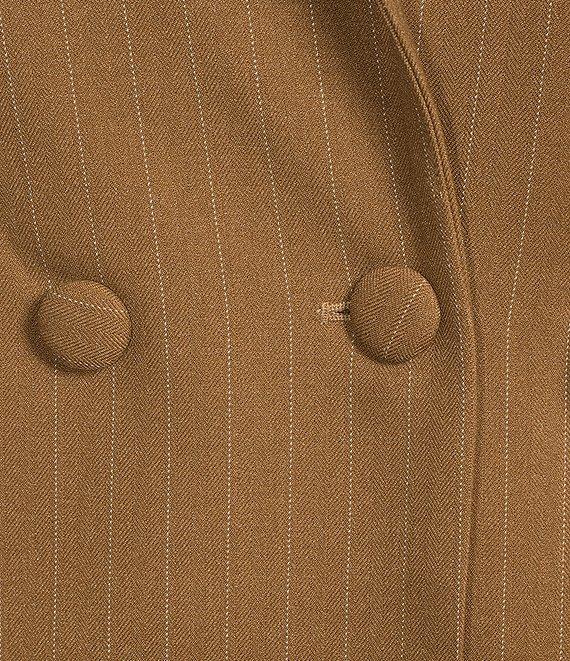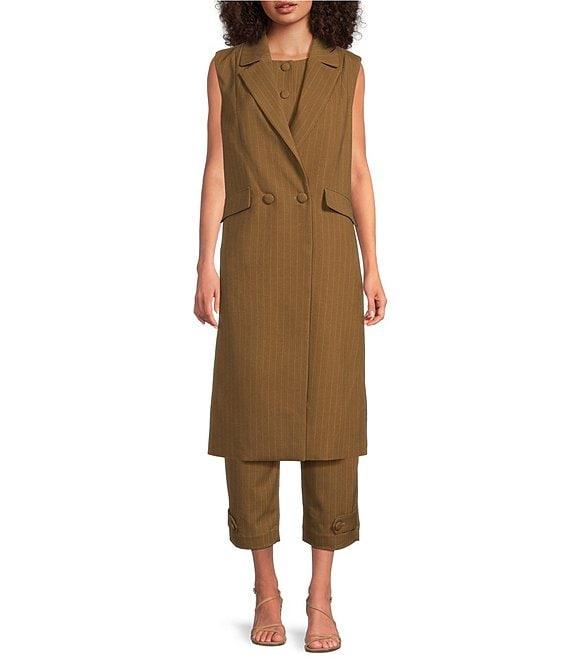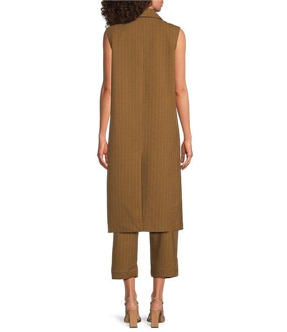 From Gibson & Latimer, this duster features: Pinstripe print Woven fabrication Notch lapel collar V-neckline Sleeveless Double breasted Button front closure Pull-on construction Side welt pocket Duster silhouette Modern fit Longline length Approx. 42" HPS in length Polyester/rayon/spandex Professional dry cleaning Imported. Dillard's Exclusive
